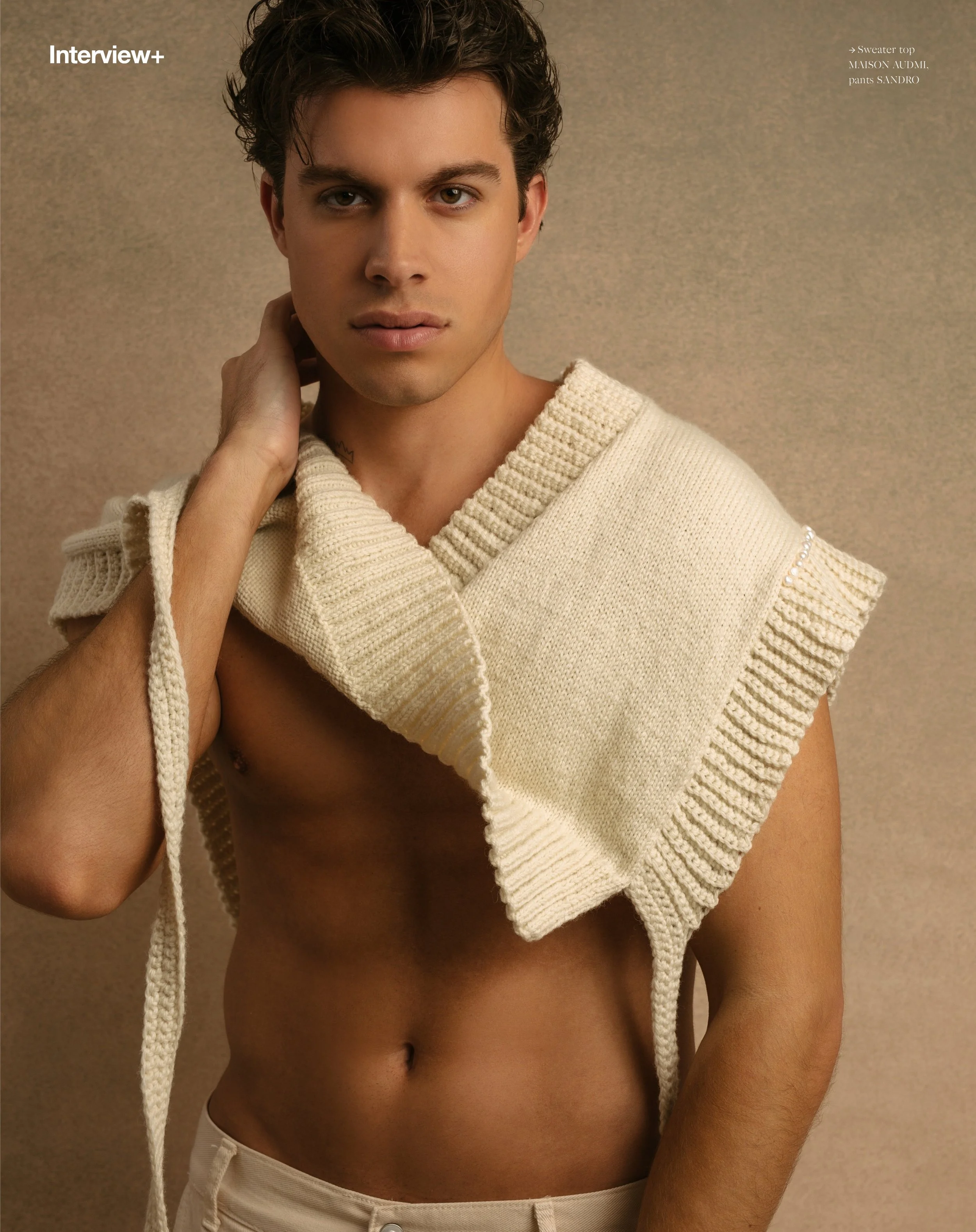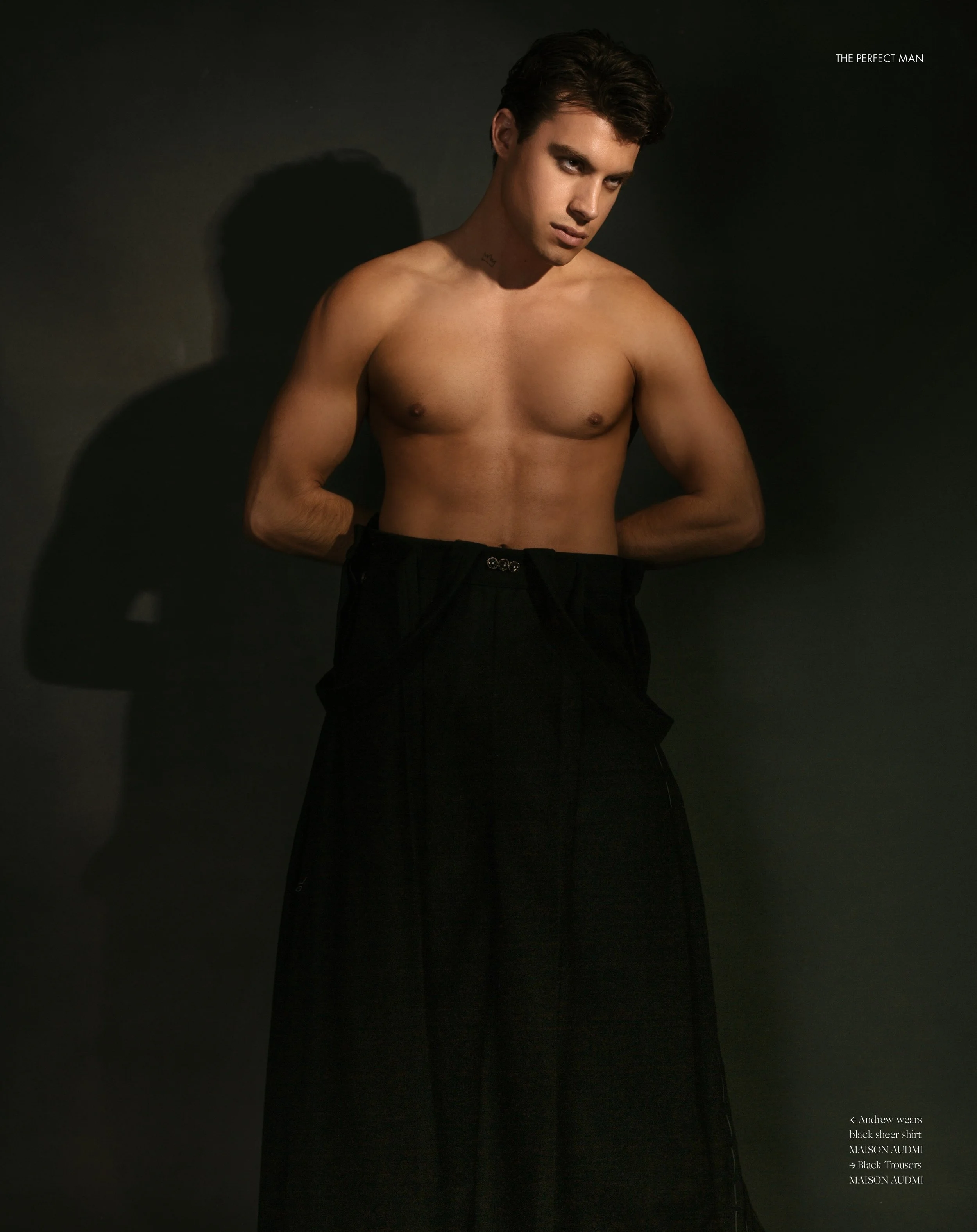 1-2. Andrew wears black sheer shirt MAISON AUDMI, Black Trousers MAISON AUDMI 3-4. Andrew wears beaded top and trousers CHARLES & RON, Shirt FIORUCCI, tank SANDRO, jeans FIORUCCI, shoes JEAN-BAPTISTE RAUTUREAU 5-6. Sweater top MAISON AUDMI, pants SANDRO 7-8. Andrew wears black sheer shirt MAISON AUDMI, Red blazer OCEAN REBEL