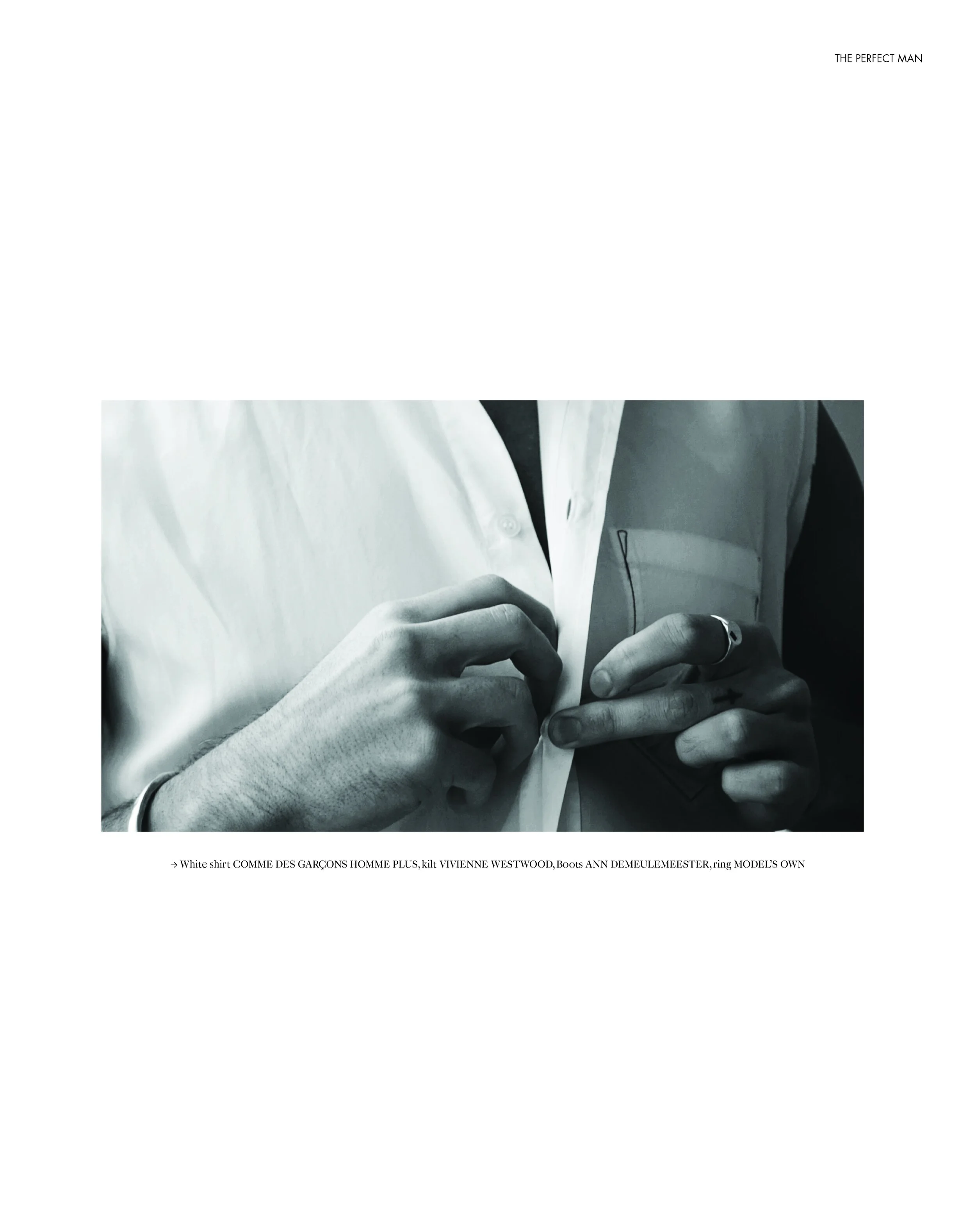 1. Andrew wears white shirt COMME DES CARCON HOMME PLUS, kilt VIVIENNE WESTWOOD, boots ANN DEMEULEMEESTER 2. Andrew wears tank top THOM BROWNE, Jacket, shirt, tie, oxfords, and vintage corset THOM BROWNE 3. Andrew wears vest, MARGIELA, jeans 3X1 4. Andrew wears jacket, shirt, tie, oxfords, and vintage corset THOM BROWNE, white shirt COMME DES CARCON HOMME PLUS, kilt Vivienne Westwood, Boots ANN DEMEULEMEESTER 5. Andrew wears white shirt COMME DES CARCON HOMME PLUS SHIRT