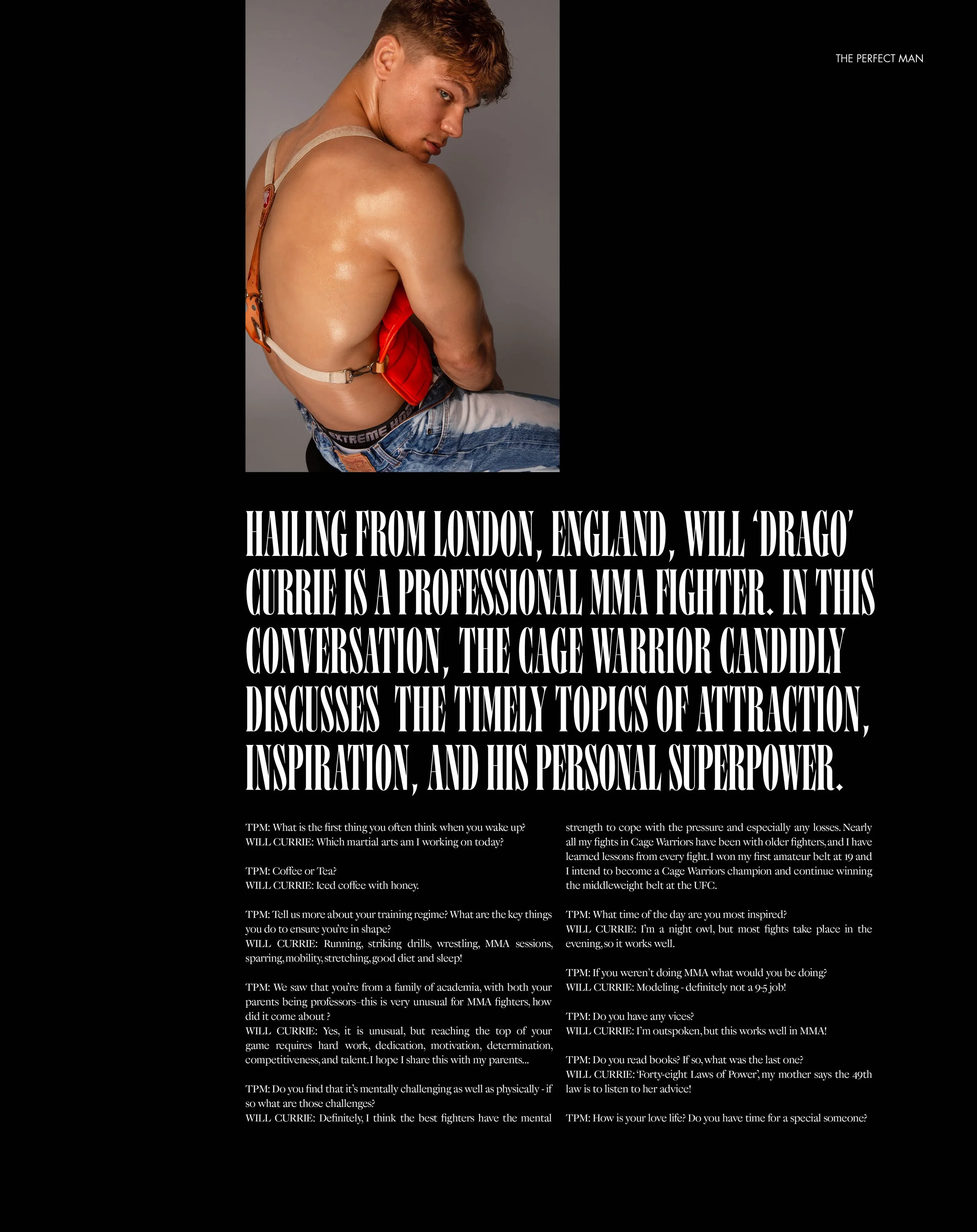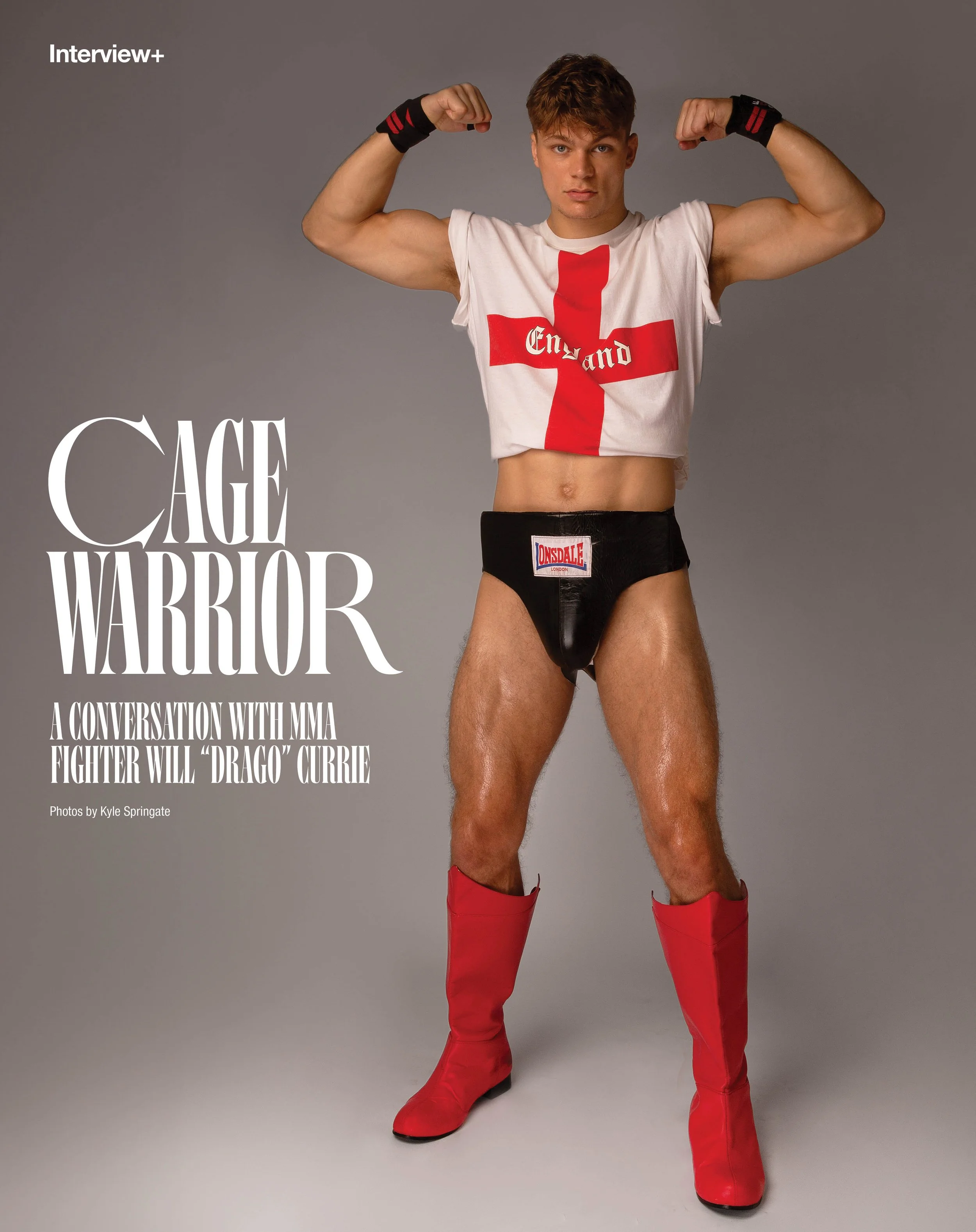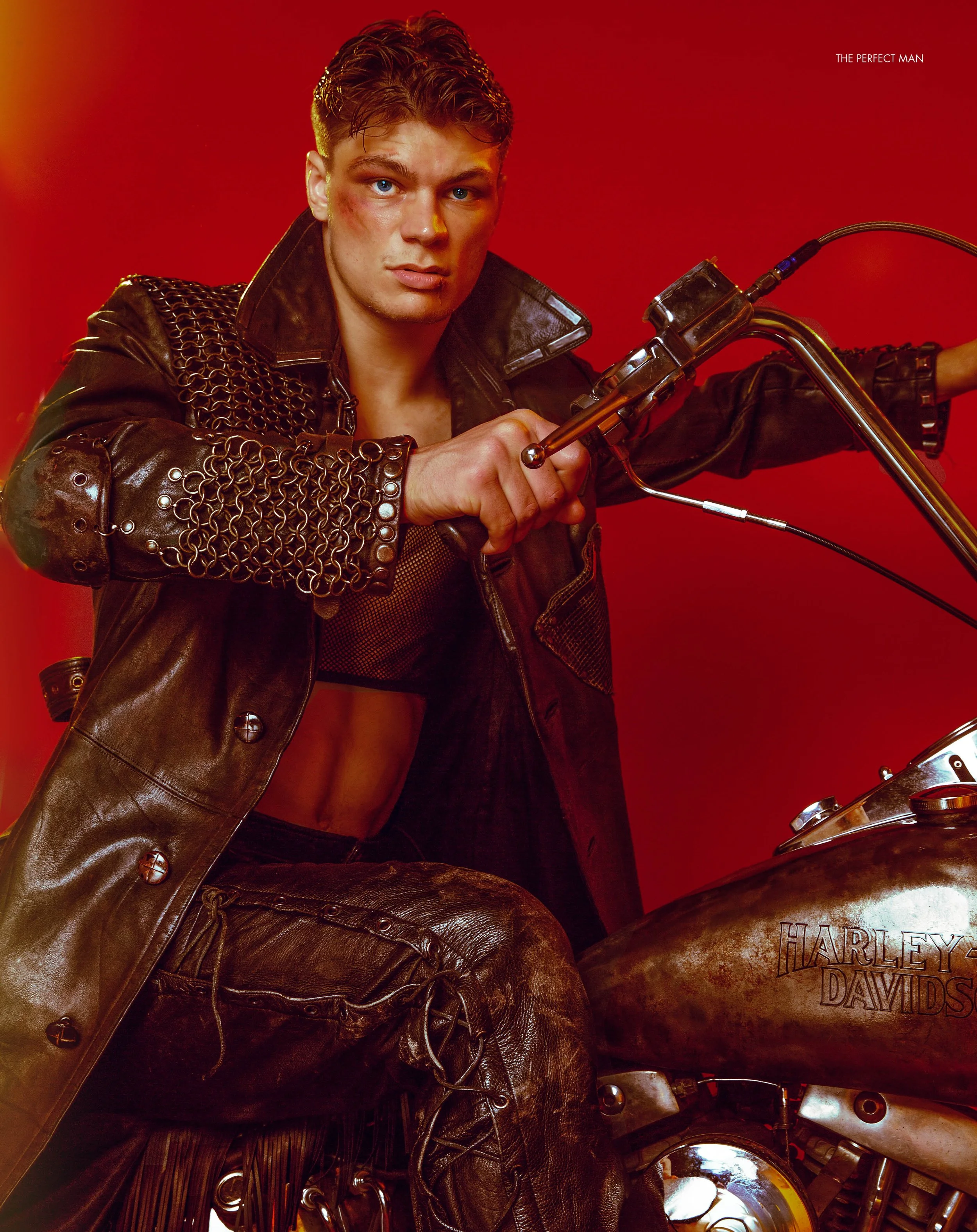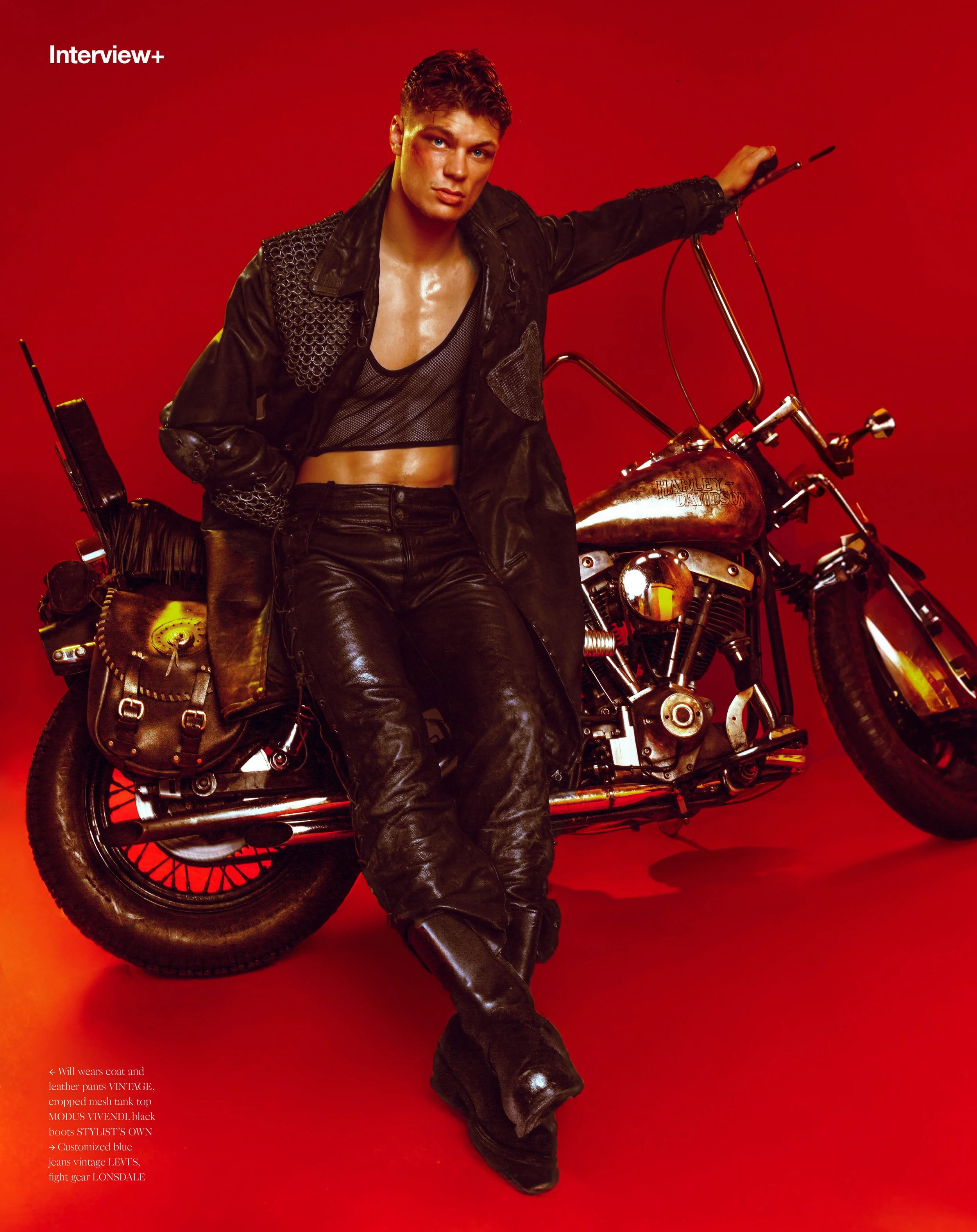 1-2. Will Currie wears fight gear LONSDALE, England t-shirt and boots STYLIST’S OWN, Red mesh tank top MODUS VICENDI, black swimmers SLAZENGER, jewelry STYLIST’S OWN 3-4. Will wears coat and leather pants VINTAGE, cropped mesh tank top MODUS VIVENDI, black boots STYLIST’S OWN, Customized blue