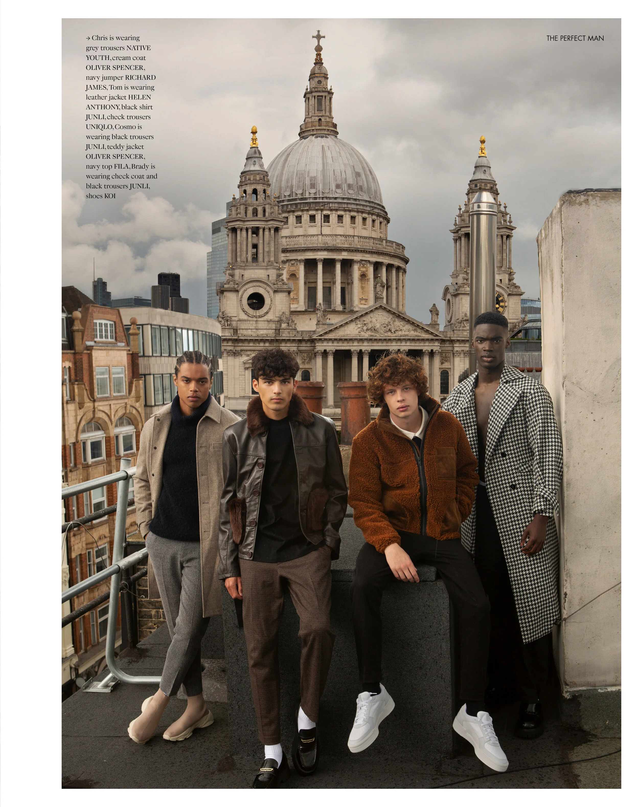 1. Chris is wearing grey trousers NATIVE YOUTH, cream coat OLIVER SPENCER, navy jumper RICHARD JAMES, Tom is wearing leather jacket HELEN ANTHONY, black shirt JUNLI, check trousers UNIQLO, Cosmo is wearing black trousers JUNLI, teddy jacket OLIVER SPENCER, navy top FILA, Brady is wearing check coat and black trousers JUNLI, shoes KOI 2. Brady is wearing check coat and black trousers JUNLI, shoes KOI, Tom is wearing brown leather jacket HELEN ANTHONY, black shirt JUNLI, check trousers UNIQLO, Grey jacket SCABAL, green polo BELLFIELD CHEVRON, black trousers RECLAIMED VINTAGE 3. Chris is wearing grey trousers NATIVE YOUTH, Tom is wearing trousers OLIVER SPENCER, Cosmo is wearing suit HELEN ANTHONY 4. Chris is wearing suit OLIVER SPENCER, black shirt SIXTH JUNE, shoes NIKE, Cosmo is wearing suit SCOTCH & SODA, smart jersey shirt JACK & JONES, shoes WALK LONDON, Tom is wearing green polo BELLFIELD VINTAGE, black trousers RECLAIMED VINTAGE, shoes KOI 5. Brady is wearing check coat and black trousers JUNLI, shoes KOI, Tom is wearing brown leather jacket HELEN ANTHONY, black shirt JUNLI, check trousers UNIQLO, Cosmo is wearing black trousers JUNLI, teddy jacket OLIVER SPENCER, navy top FILA 6. Cosmo is wearing suit SCOTCH & SODA, smart jersey shirt JACK & JONES, shoes WALK LONDON, Brady is wearing gray blazer RICHARD JAMES, blue shirt JACK & JONES, bow tie TWISTED TAILOR, Chris is wearing coat SCOTCH & SODA, grey trousers NATIVE YOUTH 7. Tom is wearing green polo BELLFIELD VINTAGE, black trousers RECLAIMED VINTAGE, shoes KOI, Cosmo is wearing suit SCOTCH & SODA, smart jersey shirt JACK & JONES, Suit OLIVER SPENCER, black shirt SIXTH JUNE, shoes NIKE