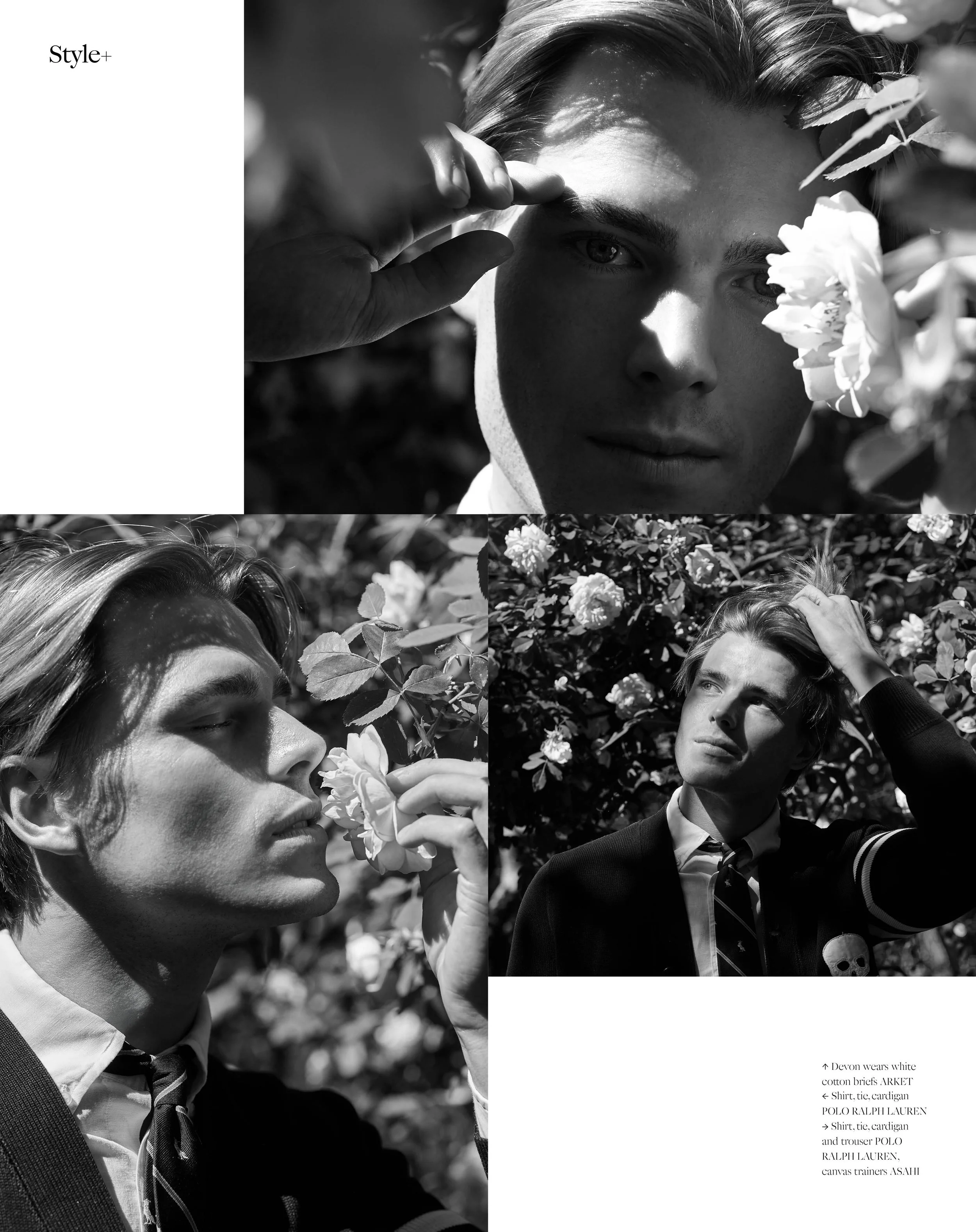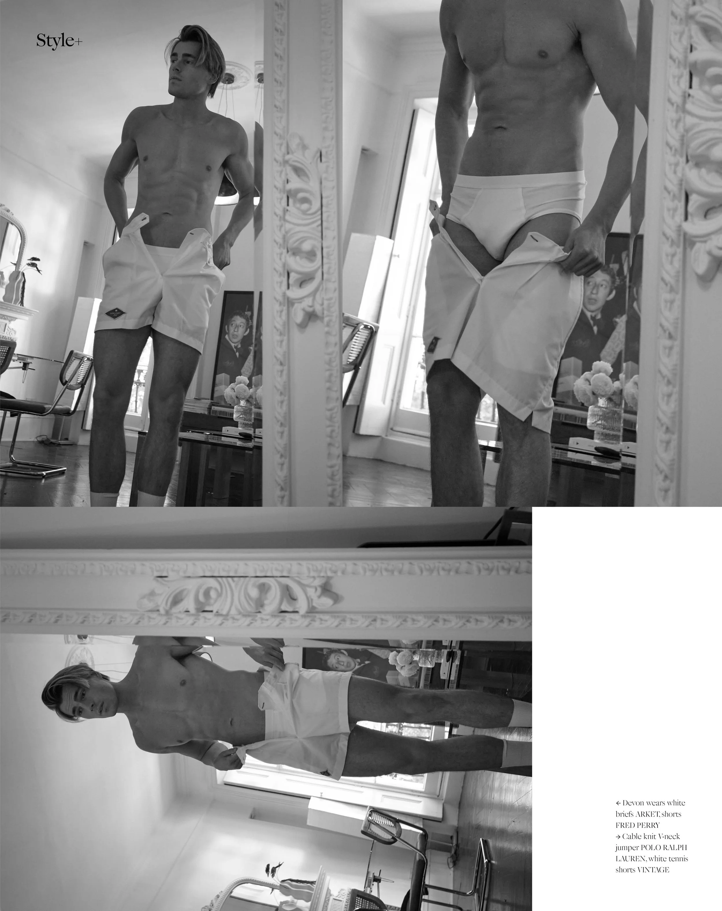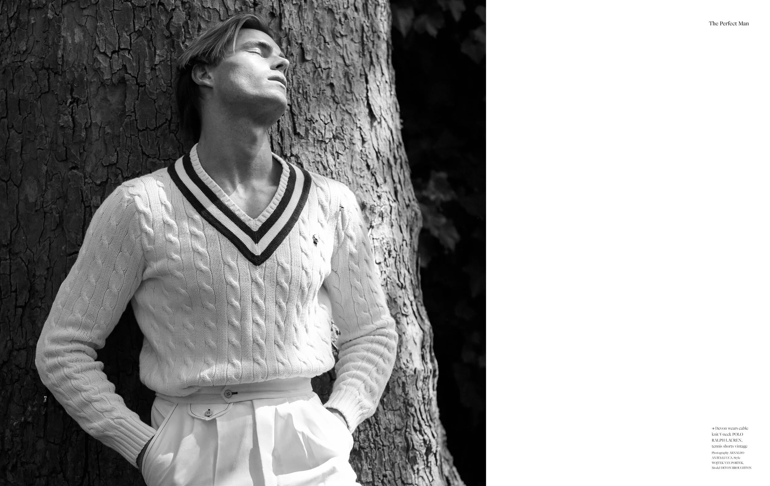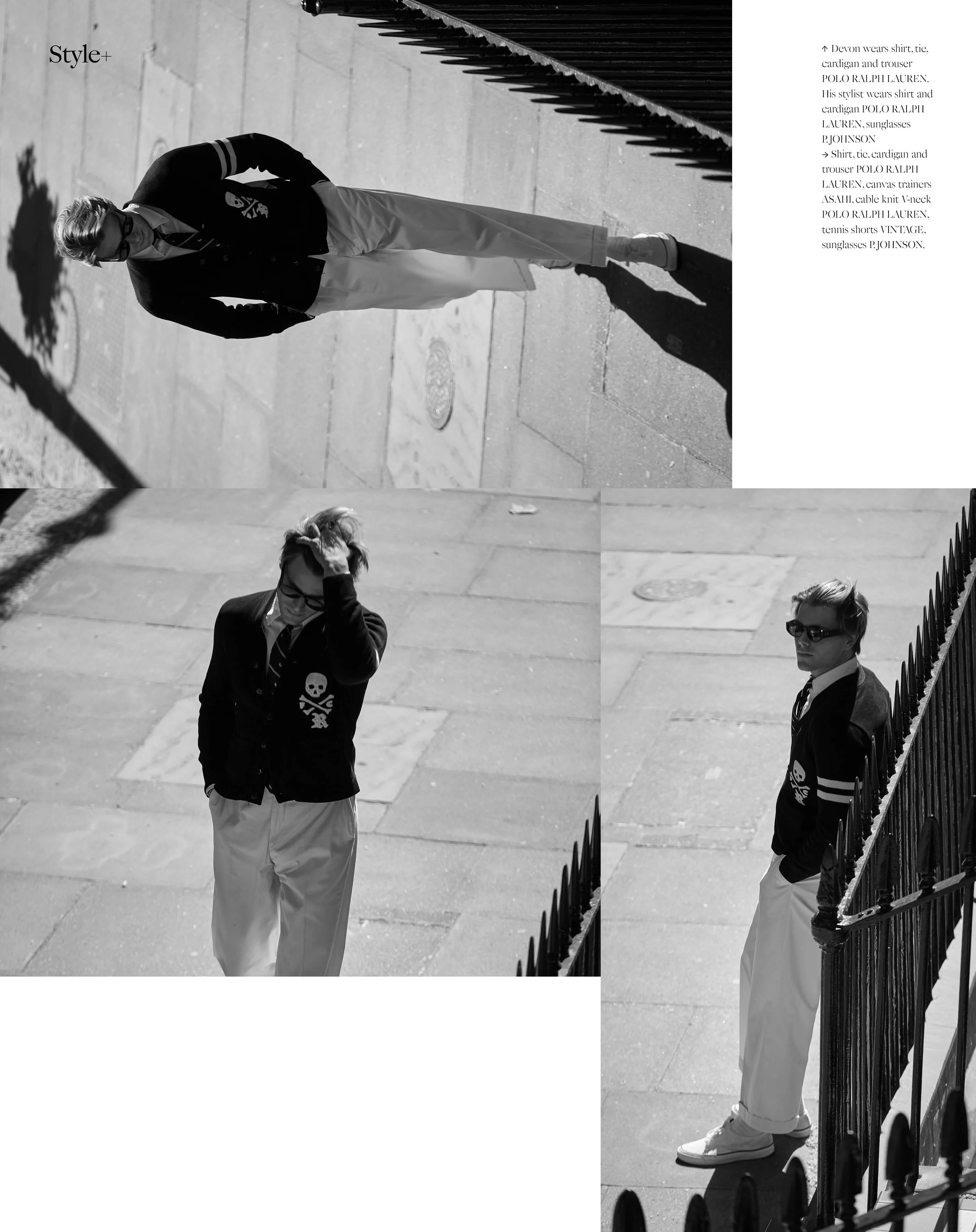 1-4. Devon wears shirt, tie, cardigan and trouser POLO RALPH LAUREN. His stylist wears shirt and cardigan POLO RALPH LAUREN, sunglasses P. JOHNSON, Shirt, tie, cardigan and trouser POLO RALPH LAUREN, canvas trainers ASAHI, cable knit V-neck POLO RALPH LAUREN, tennis shorts VINTAGE, sunglasses P. JOHNSON 5-8. Devon wears white briefs ARKET, shorts FRED PERRY, Cable knit V-neck jumper POLO RALPH LAUREN, white tennis shorts VINTAGE 9-12. Devon wears white cotton briefs ARKET, Shirt, tie, cardigan POLO RALPH LAUREN, Shirt, tie, cardigan and trouser POLO RALPH LAUREN, canvas trainers ASAHI 13-14. Devon wears cable knit V-neck POLO RALPH LAUREN, tennis shorts vintage