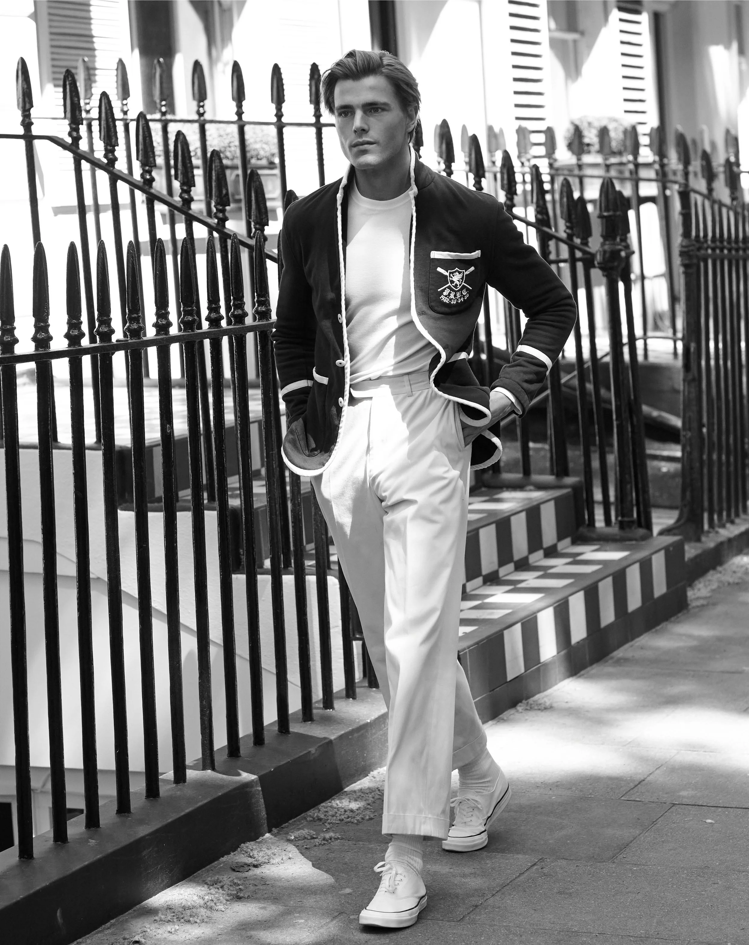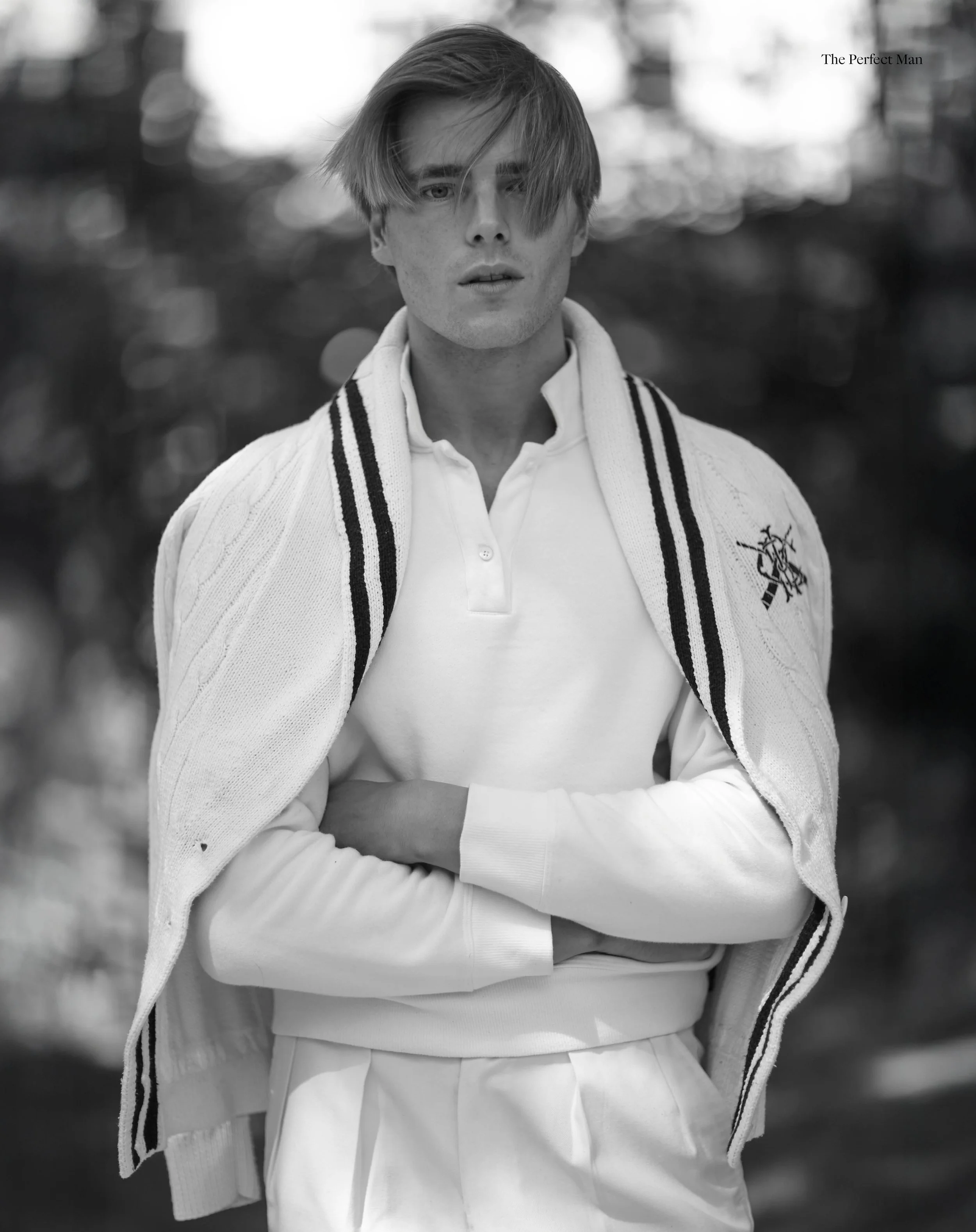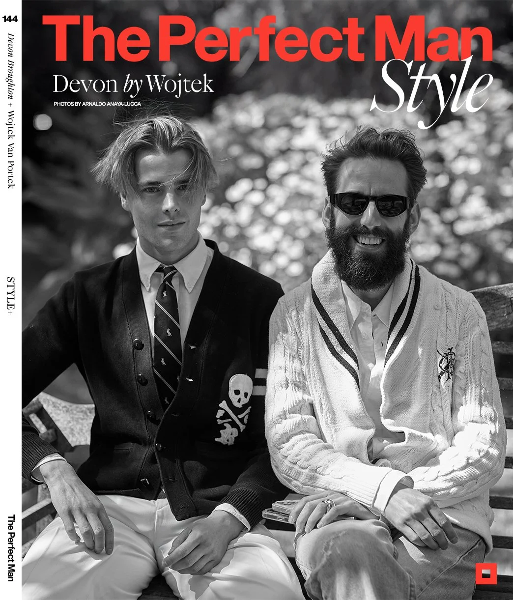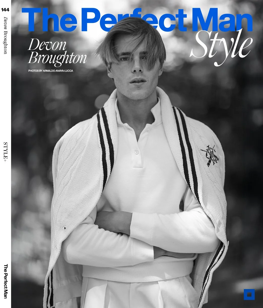 1-4. Devon wears shirt, tie, cardigan and trouser POLO RALPH LAUREN. His stylist wears shirt and cardigan POLO RALPH LAUREN, sunglasses P. JOHNSON, Shirt, tie, cardigan and trouser POLO RALPH LAUREN, canvas trainers ASAHI, cable knit V-neck POLO RALPH LAUREN, tennis shorts VINTAGE, sunglasses P. JOHNSON 5-8. Devon wears white briefs ARKET, shorts FRED PERRY, Cable knit V-neck jumper POLO RALPH LAUREN, white tennis shorts VINTAGE 9-12. Devon wears white cotton briefs ARKET, Shirt, tie, cardigan POLO RALPH LAUREN, Shirt, tie, cardigan and trouser POLO RALPH LAUREN, canvas trainers ASAHI 13-14. Devon wears cable knit V-neck POLO RALPH LAUREN, tennis shorts vintage