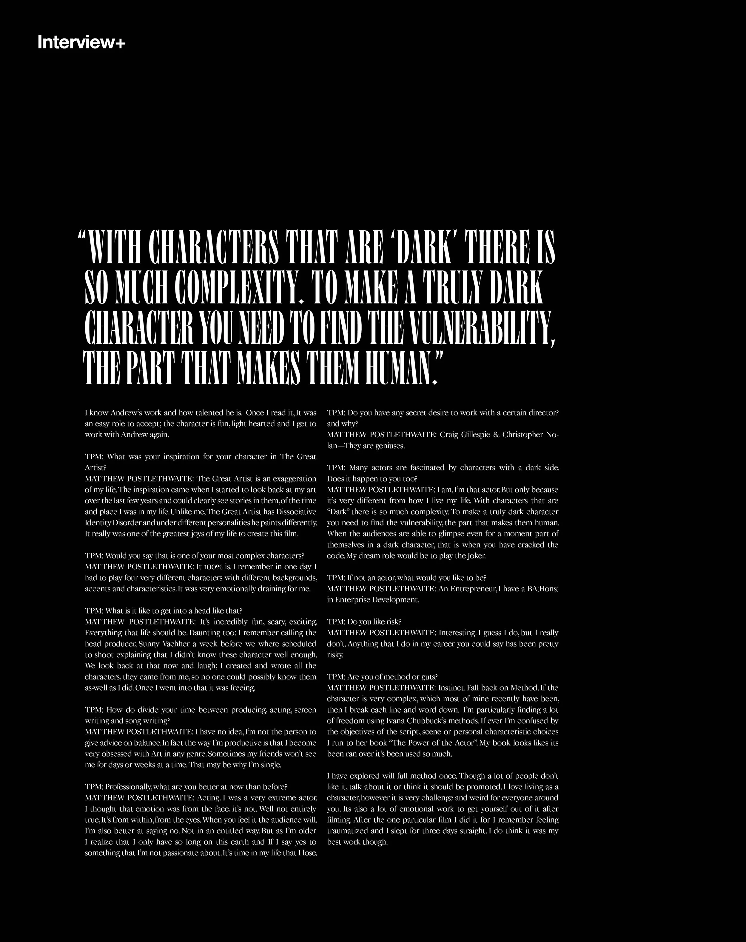 I am. I’m that actor. But only because it’s very different from how I live my life. With characters that are “Dark” there is so much complexity. To make a truly dark character you need to find the vulnerability, the part that makes them human. When the audiences are able to glimpse even for a moment part of themselves in a dark character, that is when you have cracked the code. My dream role would be to play the Joker.