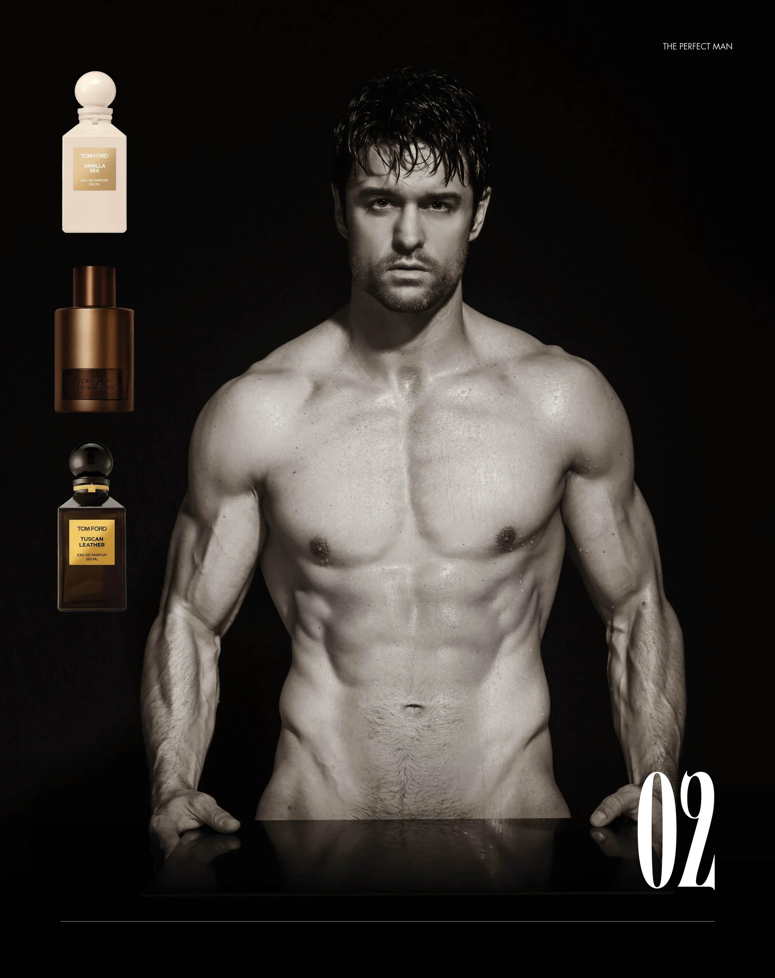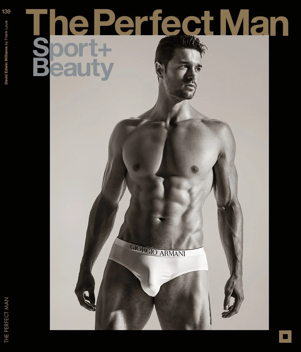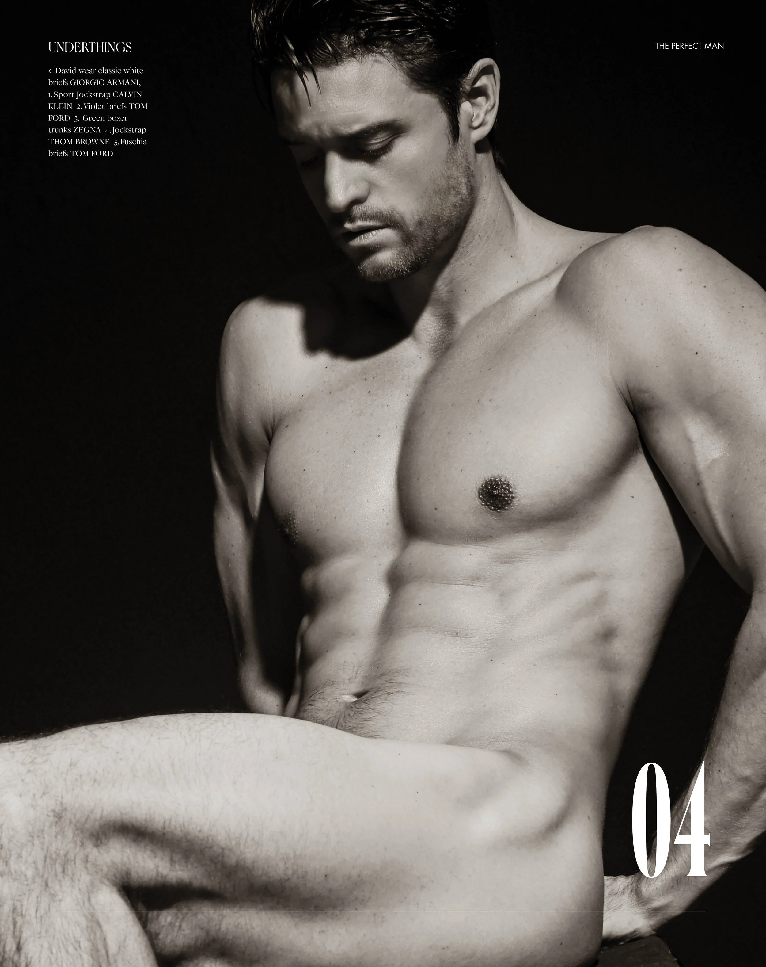 1-2. David Edwin Williams wears black briefs ZEGNA 3-4. TOM FORD SCENTS: David wears black leather jacket and pants VINTAGE, 1. Myrrhe Mystére Eau de Parfum  2. Costa Azzura Eau de Parfum  3. Ombré Leather Eau de Parfum, Vanilla Sex Eau de Parfum  4. Oud Minérale Eau de Parfum  5. Tuscan Leather Eau de Parfum 5-6. UNDERTHINGS: David wear classic white briefs GIORGIO ARMANI, 1. Sport Jockstrap CALVIN KLEIN  2. Violet briefs TOM FORD  3. Green boxer trunks ZEGNA  4. Jockstrap THOM BROWNE  5. Fuschia briefs TOM FORD 7-8. TOILETRY POUCHES: Black leather medicine ball FYSIK, 1. Brown leather toiletry pouch SATCHEL & PAGE  2. Black leather drawstring pouch TOM FORD  3. Print toiletry pouch DIOR  4. Brown leather toiletry pouch BRUNELLO CUCINELLI, GYM BAGS: 1. Light brown leather duffle RALPH LAUREN 2. Multi-color woven leather duffle BOTTEGA VENETA  3. Nylon duffle SAINT LAURENT 4. Multi-color woven leather duffle BOTTEGA VENETA 9-10. DIOR SCENTS: 1. Eau de Toilette  2. Eau Sauvage Eau de Toilette 3. New Look Eau de Parfum 4. Farenheit Eau de Toilette  5. Sauvage Elixir Parfum