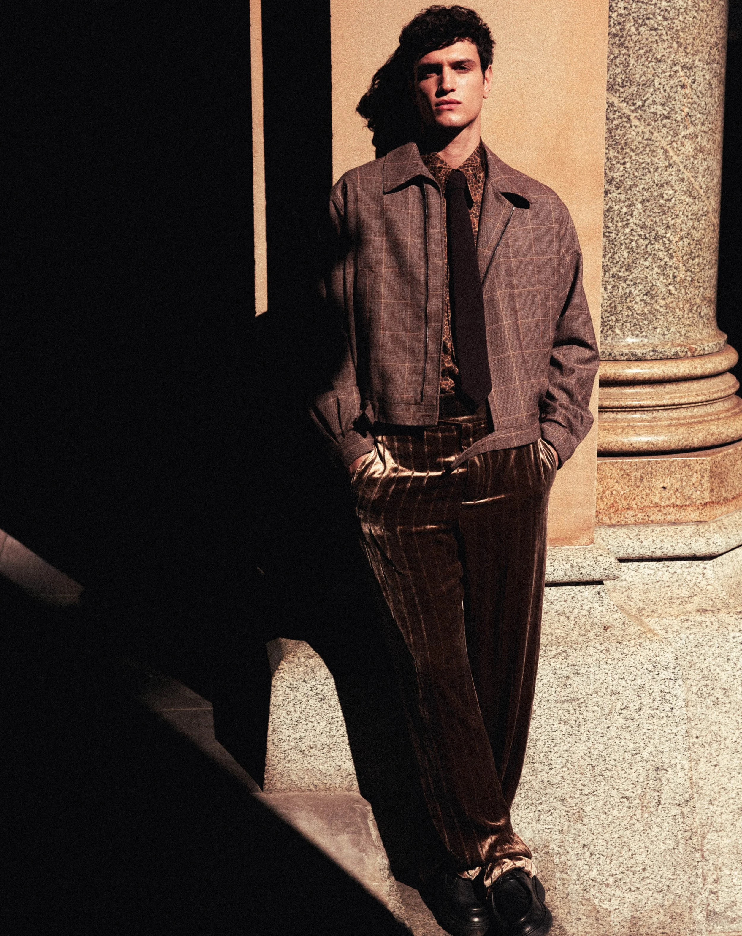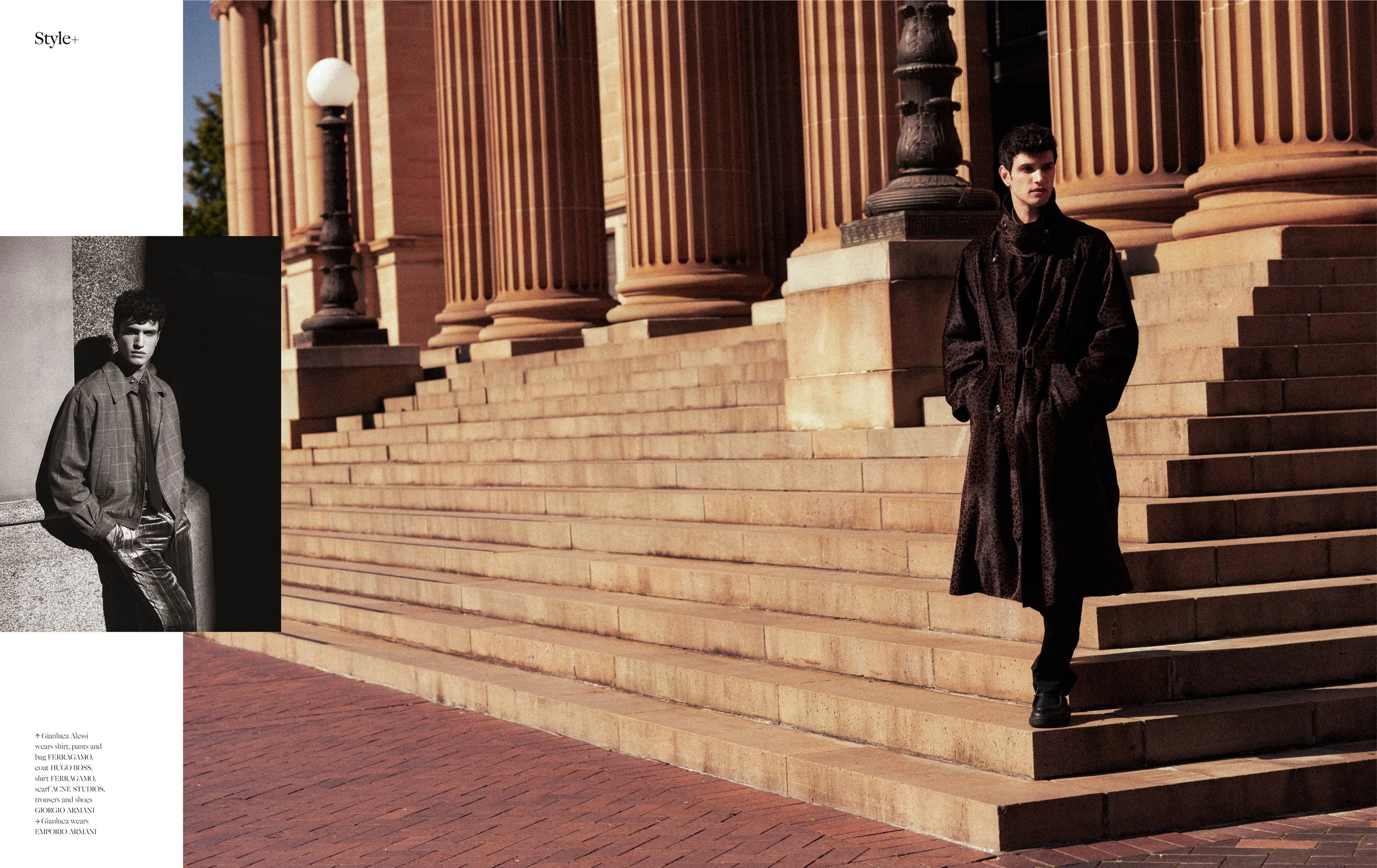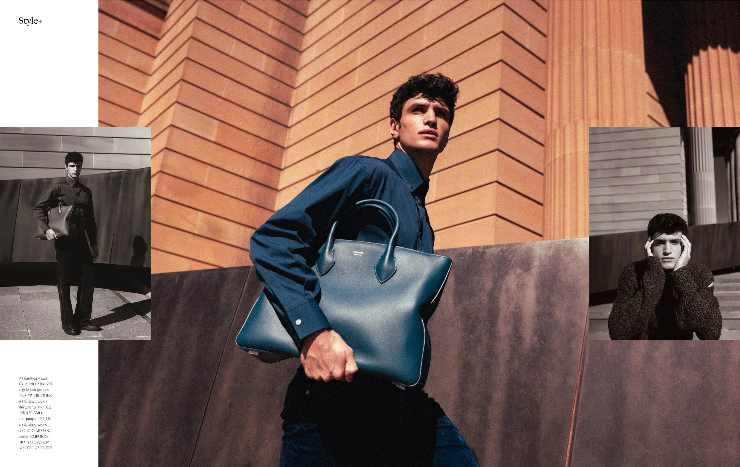 1-4. Gianluca Alessi wears shirt, pants and bag FERRAGAMO, coat HUGO BOSS, shirt FERRAGAMO, scarf ACNE STUDIOS, trousers and shoes GIORGIO ARMANI, Gianluca wears EMPORIO ARMANI 5-8. Gianluca wears knit jumper TOD’S, shirt FERRAGAMO, Gianluca wears printed blue denim jacket and jeans TOMMY HILFIGER 9-12. Gianluca wears EMPORIO ARMANI, argyle knit jumper TOMMY HILFIGER, Gianluca wears shirt, pants and bag FERRAGAMO, knit jumper TOD’S, Gianluca wears GIORGIO ARMANI, trench EMPORIO ARMANI, eyewear BOTTEGA VENETA 13-16. Gianluca wears coat, shirt and trousers EMPORIO ARMANI, shoes GIORGIO ARMANI