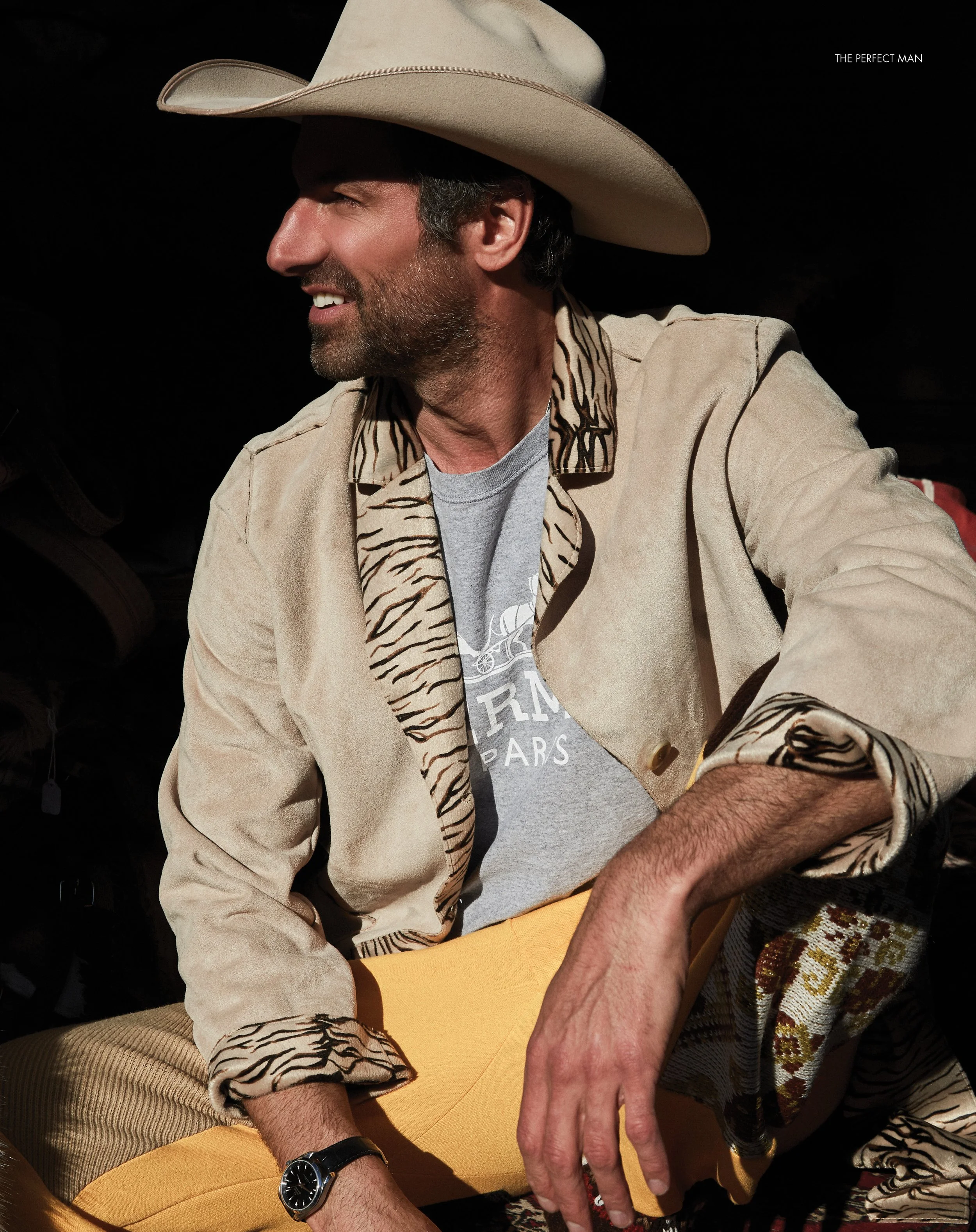 1-2. Josh Wald wears leather jacket with faux fur collar VINTAGE, eyewear THIERRY LASRY, white logo t-shirt SAINT LAURENT BY HEDI SLIMANE, belt GUCCI, slim trousers 1970’s VINTAGE, custom Seamaster Aqua Terra watch OMEGA 3-4. Josh wears leather jacket with fox collar VINTAGE, pajama shirt CHRISTIAN DIOR, vintage belt PAUL SMITH, trousers RALPH LAUREN FOR NORDSTROM, suitcase VINTAGE, two-tone leather dress shoes VINTAGE, custom Seamaster Aqua Terra watch OMEGA 5-6.     Josh wears hat STETSON, vintage shirt ADIDAS, faux snake skin trousers VINTAGE, customized slip on shoes CONVERSE, vintage duffle bag 1970’s GUCCI, Seamaster Aqua Terra watch OMEGA, cowboy hat STETSON,  grey vintage t-shirt HERMES, beige suede jacket VINTAGE, patchwork trousers VINTAGE, custom Seamaster Aqua Terra watch OMEGA 7-8. Josh wears lamb skin jacket VINTAGE, Pajama shirt VINTAGE, belt 1970’s GUCCI, 1970’s trousers VINTAGE, 1960’s boots SALVATORE FERRAGAMO leather jacket with fox collar VINTAGE, pajama shirt CHRISTIAN DIOR, vintage belt PAUL SMITH, trousers RALPH LAUREN FOR NORDSTROM, suitcase VINTAGE, two-tone leather dress shoes VINTAGE, custom Seamaster Aqua Terra watch OMEGA 9-10. Josh wears pajama shirt CHRISTIAN DIOR, vintage belt PAUL SMITH, trousers RALPH LAUREN FOR NORDSTROM, suitcase VINTAGE, custom Omega Seamaster watch OMEGA, t-shirt VINTAGE, glasses JACQUES MARIE MAGE, french printed wool sweater VINTAGE, velvet bellbottom trousers VINTAGE, Seamaster Aqua Terra watch OMEGA