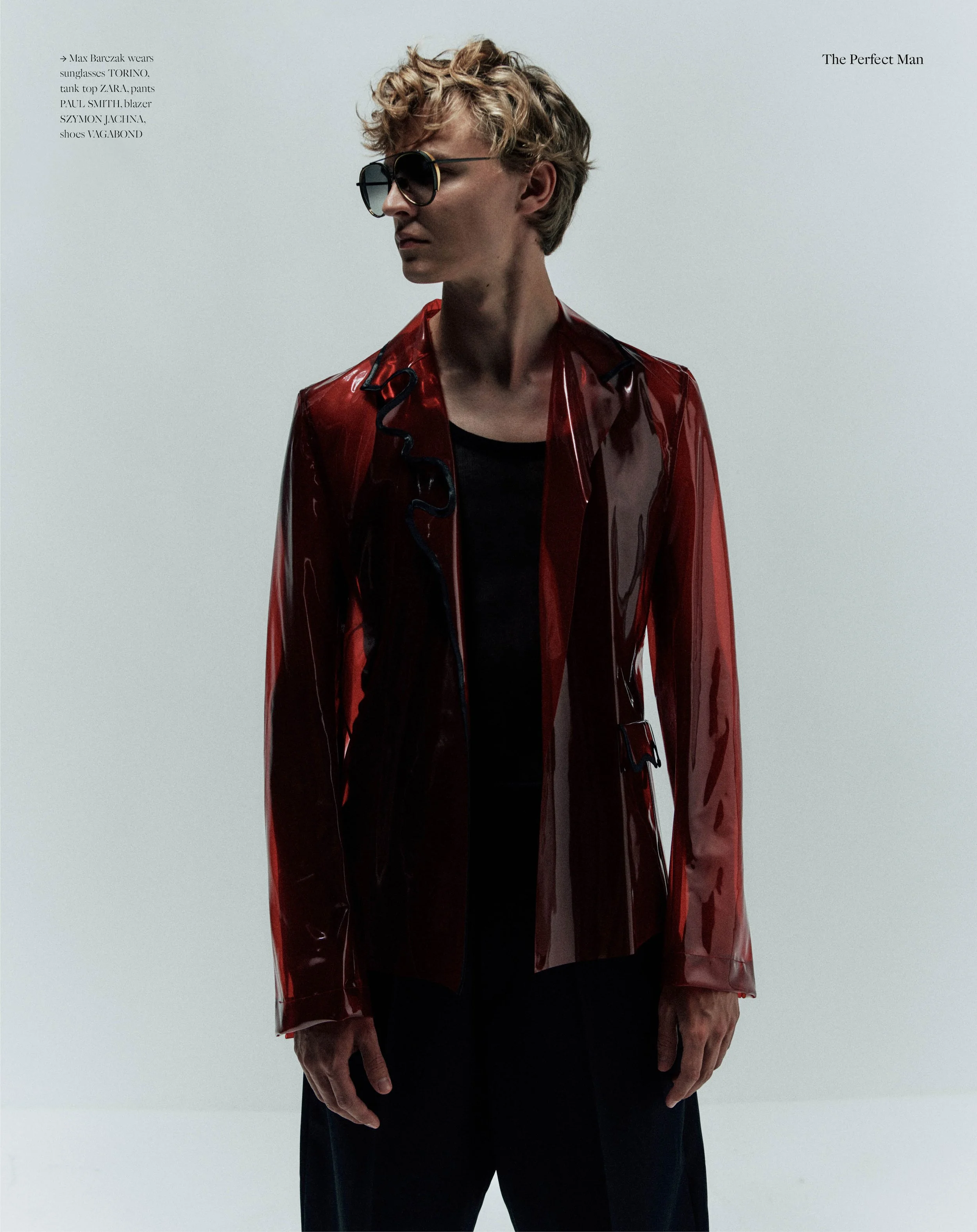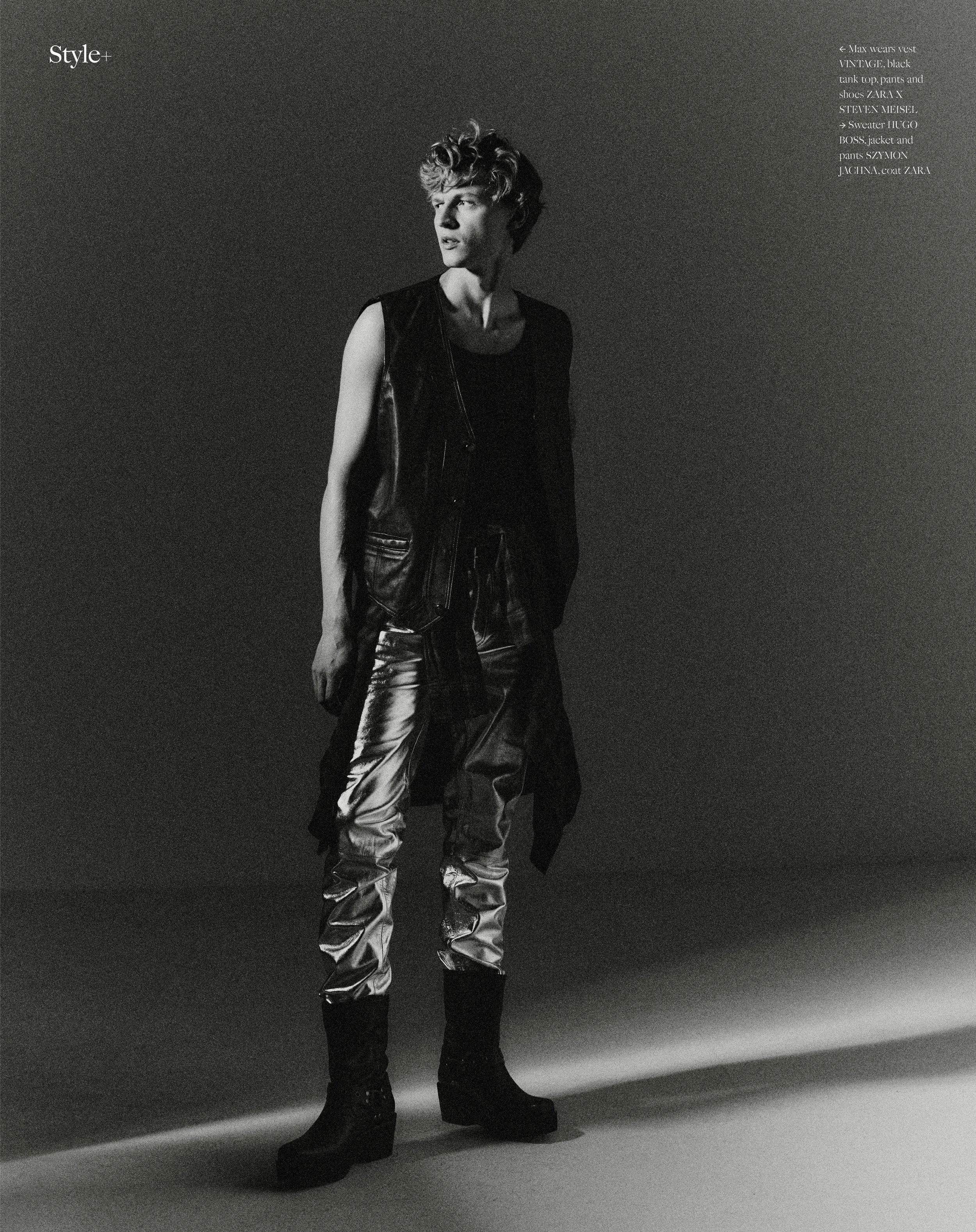 1-2. Max Barczak wears sunglasses TORINO, tank top ZARA, pants PAUL SMITH, blazer SZYMON JACHNA, shoes VAGABOND 3-4. Max wears vest VINTAGE, black tank top, pants and shoes ZARA X STEVEN MEISEL, Sweater HUGO BOSS, jacket and pants SZYMON JACHNA, coat ZARA 5-6. Max wears tank top ZARA, wide leg pants PAUL SMITH, blazer SZYMON JACHNA, shoes VAGABOND, Sheet black shirt KAROLINA SARNIAK 7-8. Max wears sweater HUGO BOSS, jacket SZYMON JACHNA, coat ZARA, pants SZYMON JACHNA 9-10. Max wears shirt KAROLINA SARNIAK, Coat ALEKSANDER MALOWIDZKI, shoes VAGABOND 9-10. Max wears shirt KAROLINA SARNIAK, Coat and pants ALEKSANDER MALOWIDZKI, shoes VAGABOND