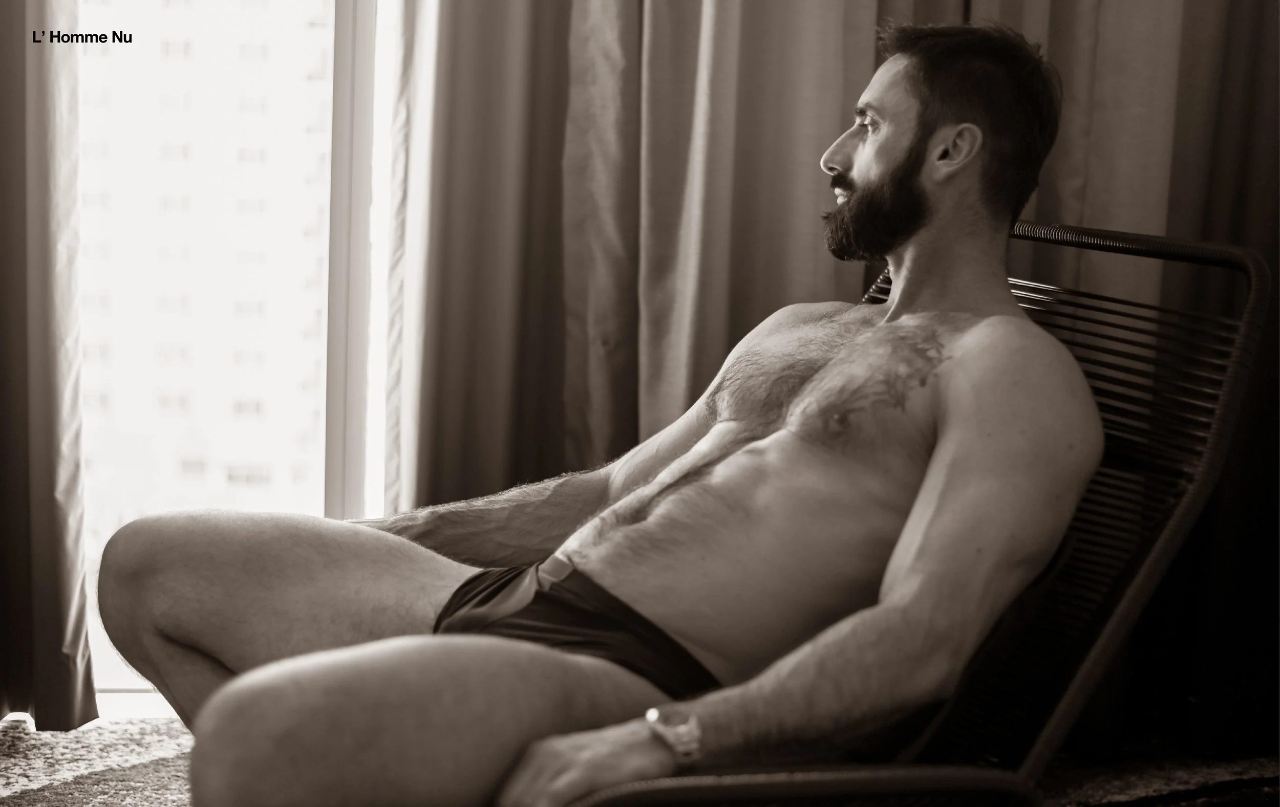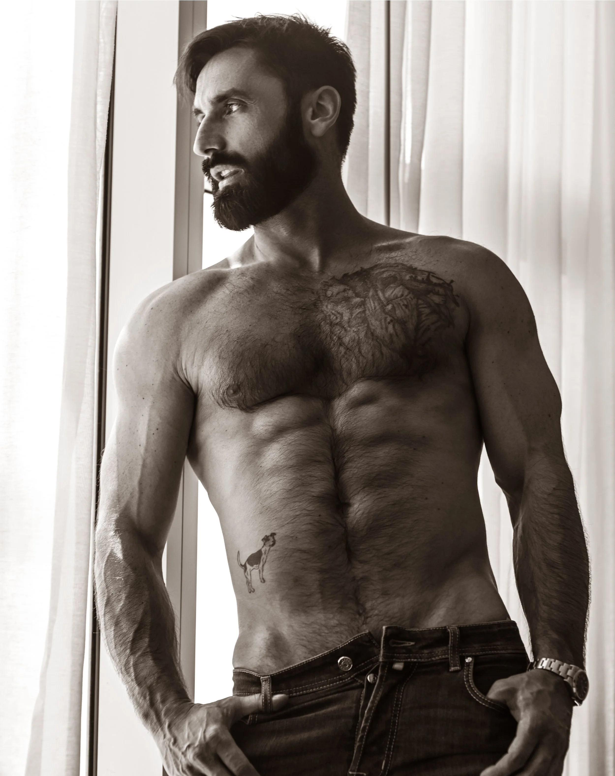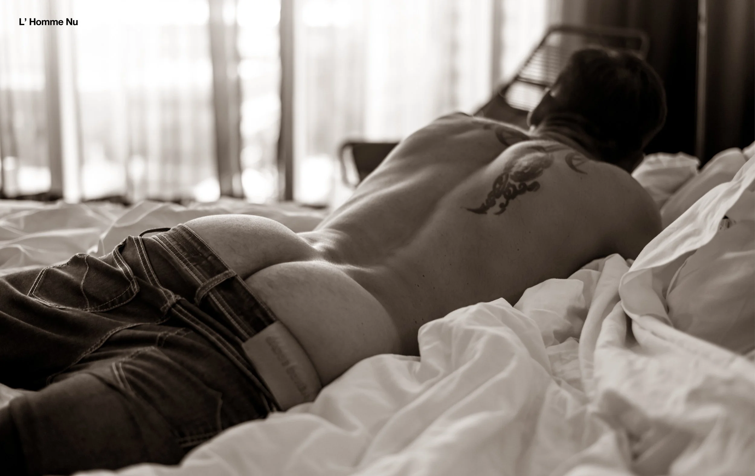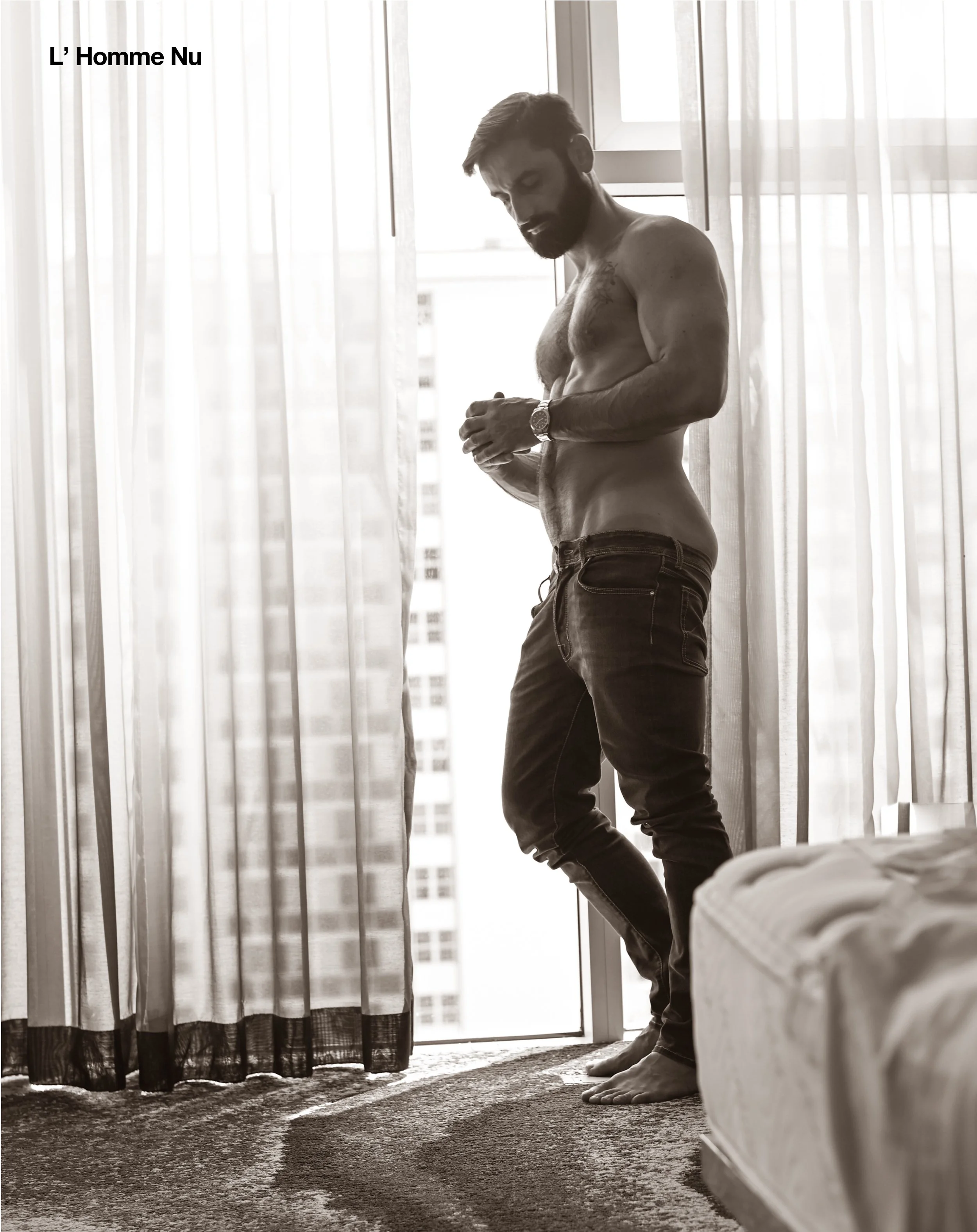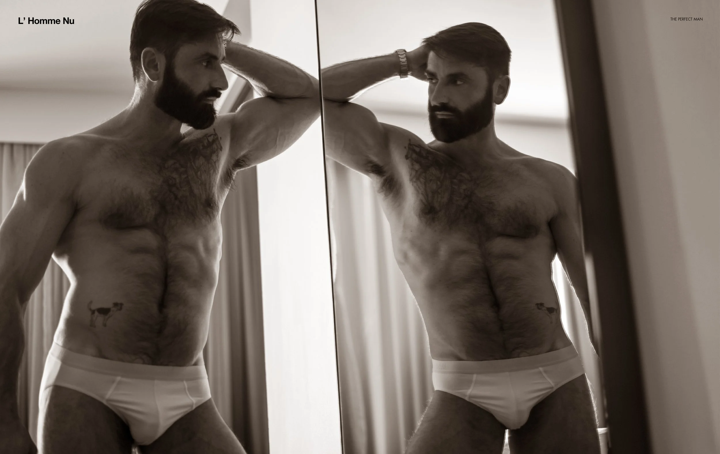 1-14. Damian Podhorodecki wears slim blue jeans JACOB COHEN, classic white briefs HANRO, black briefs ZIMMERLI