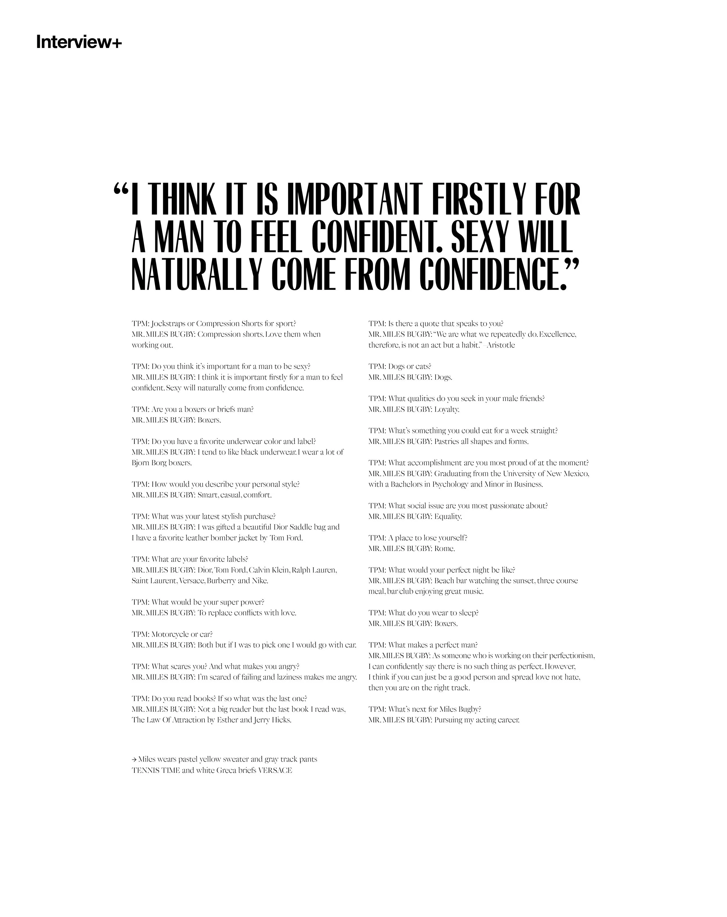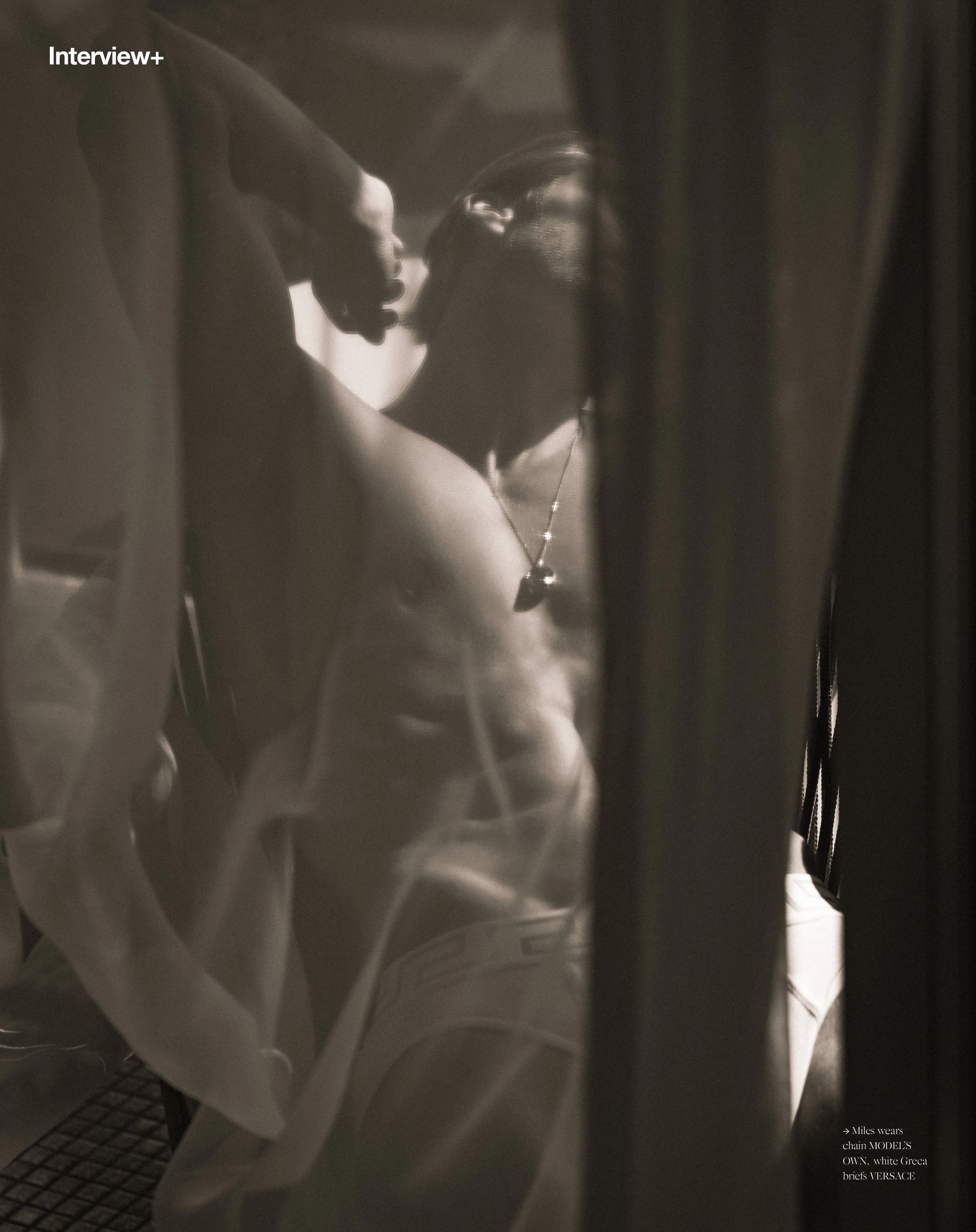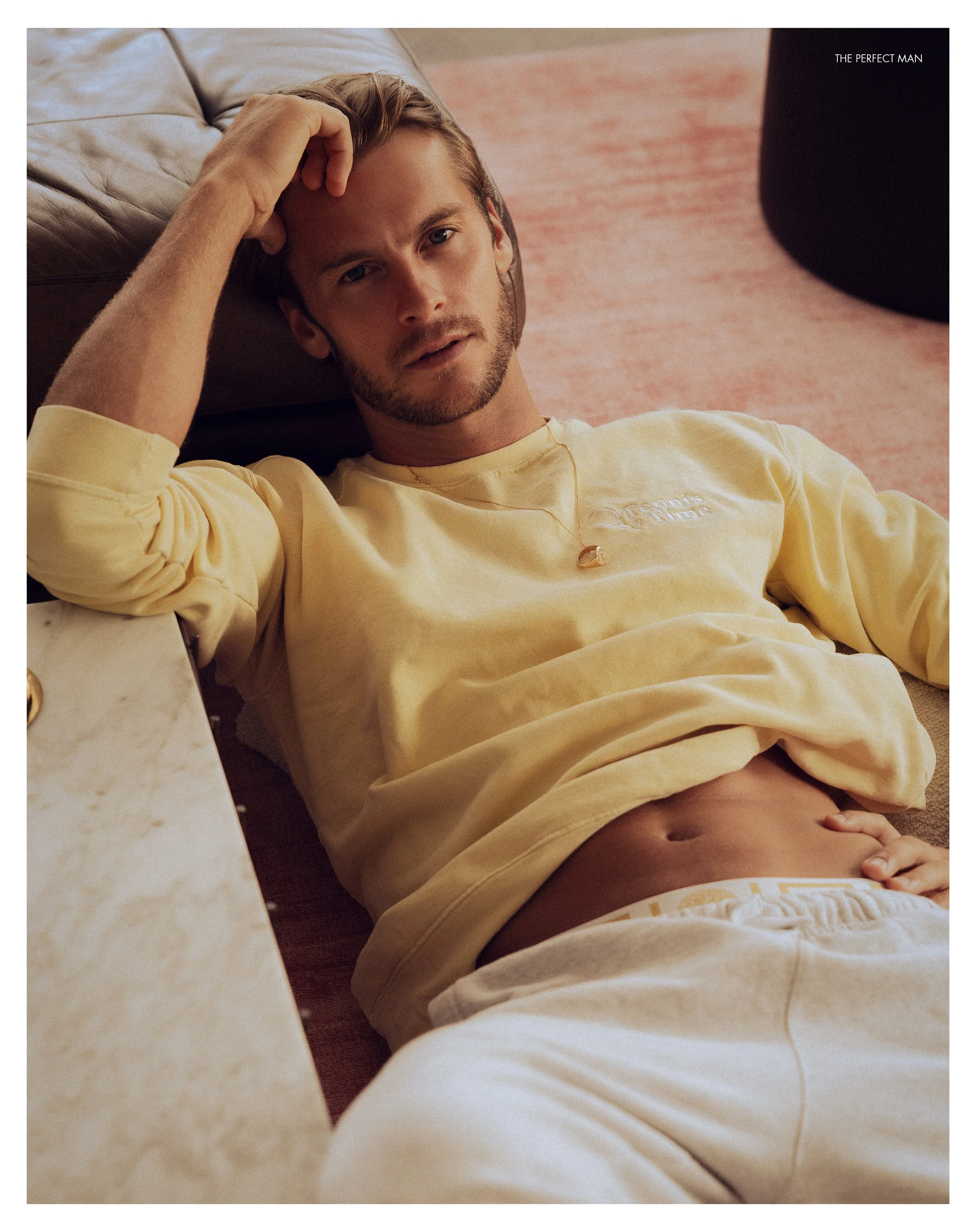 1-4. Miles Bugby wears short sleeve shirt AERE and jeans LEE, white classic Greca briefs VERSACE  5-7. Miles wears chain MODEL’S OWN,  white Greca briefs VERSACE  8-9. Miles wears track pants TENNIS TIME and white Greca briefs VERSACE. Gray sweater TENNIS TIME, white Greca briefs VERSACE  9-10. Miles wears pastel yellow sweater and gray track pants TENNIS TIME and white Greca briefs VERSACE  10-11. Miles wears gray sweater TENNIS TIME, white Greca briefs VERSACE 11-12. Miles wears gray sweater TENNIS TIME, white Greca briefs VERSACE, Gold necklace MODEL’S OWN, On hair: Airstyle Flexible Finish cream ORIBE