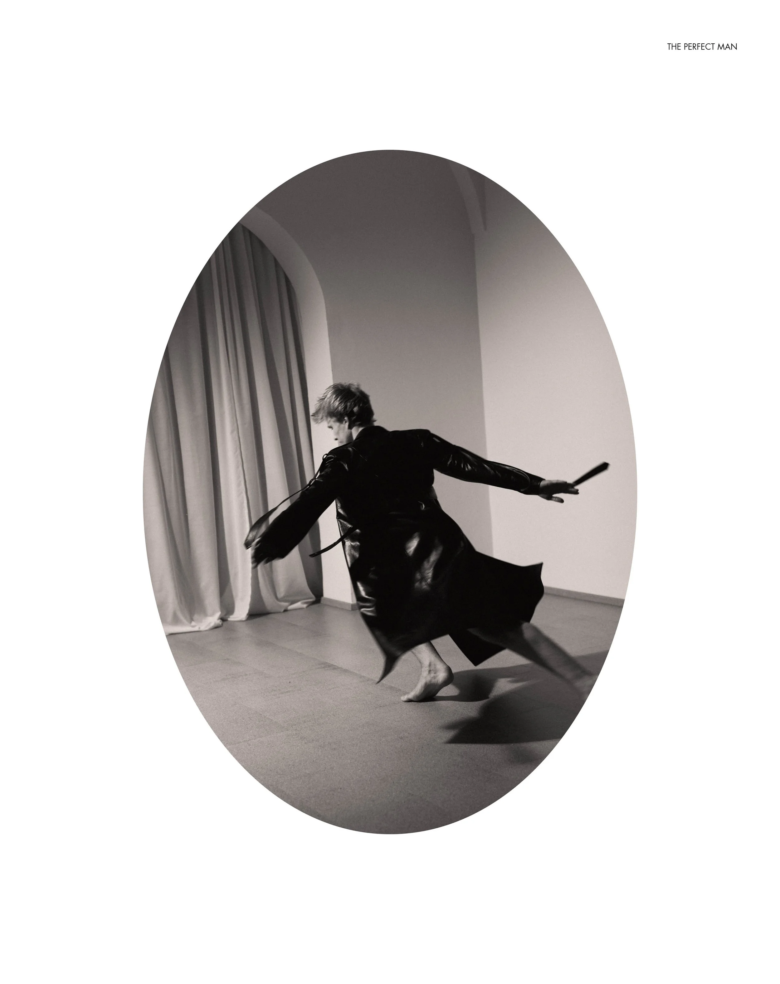 1-14. In this Story: Victor Polster wears leather coat, t-shirt and printed jumper VINTAGE, jeans LOEWE, black briefs HANRO SWITZERLAND