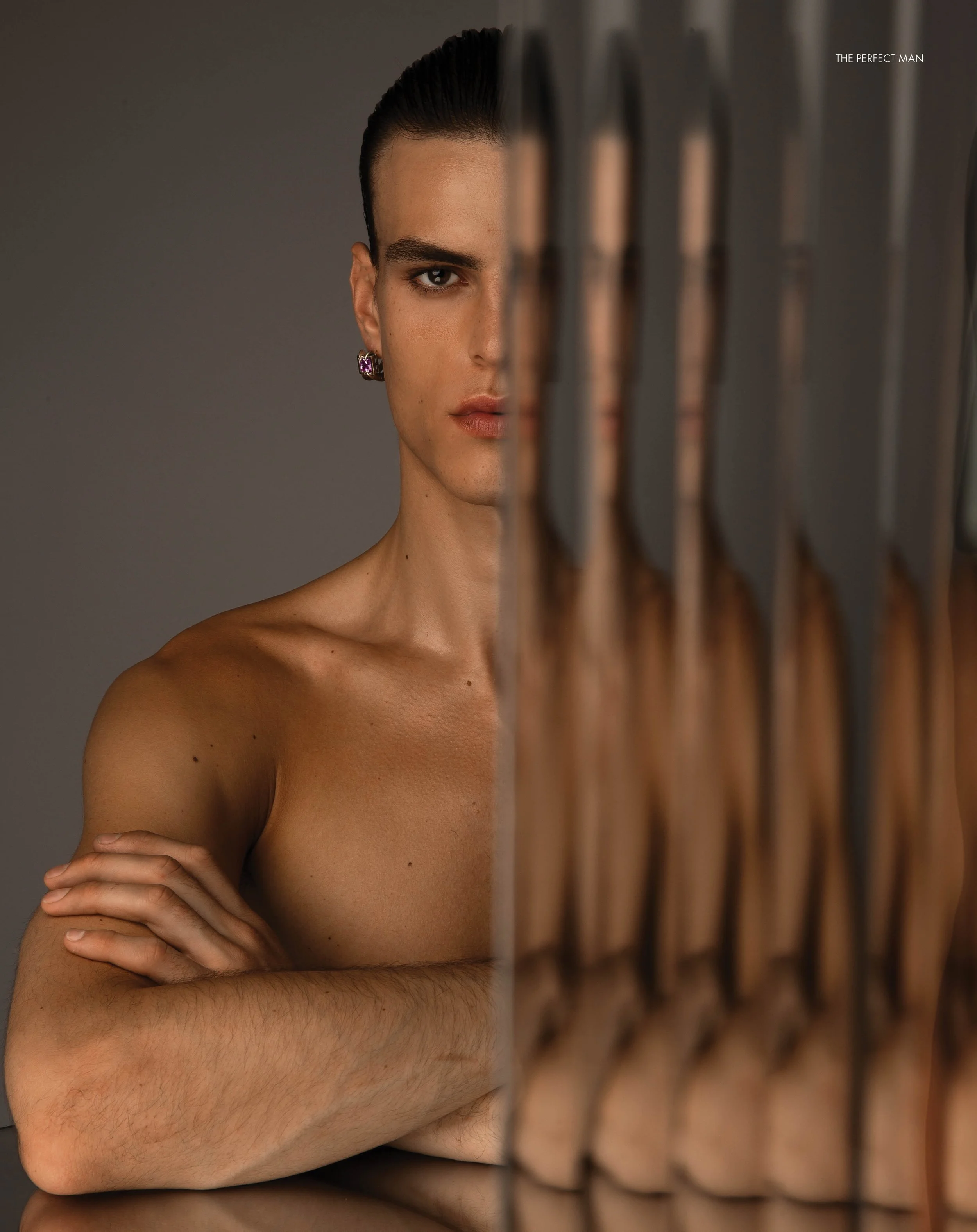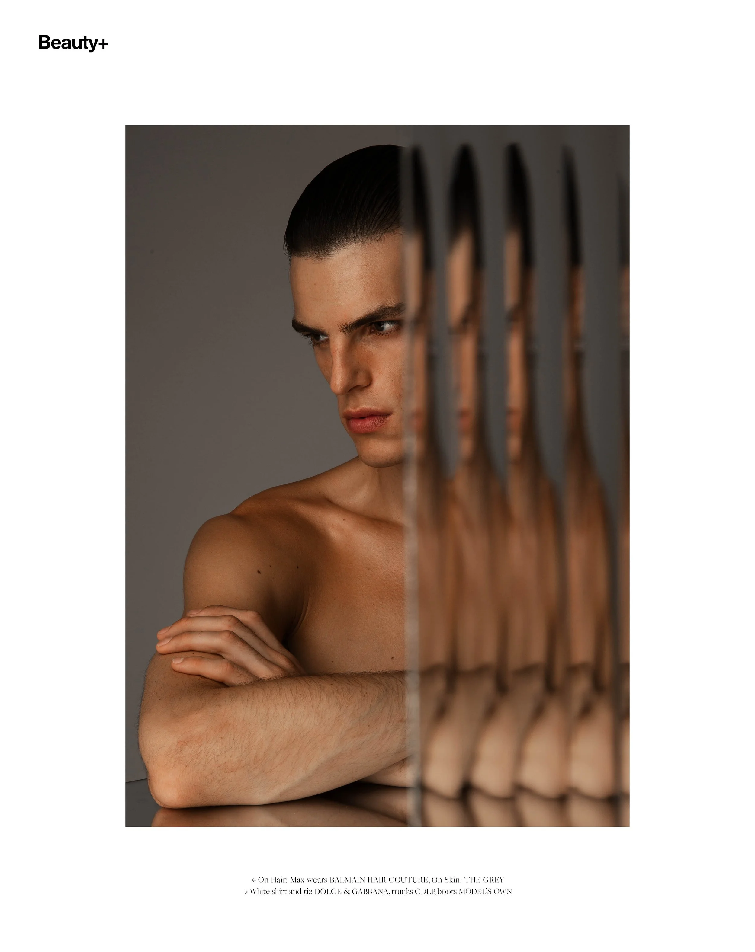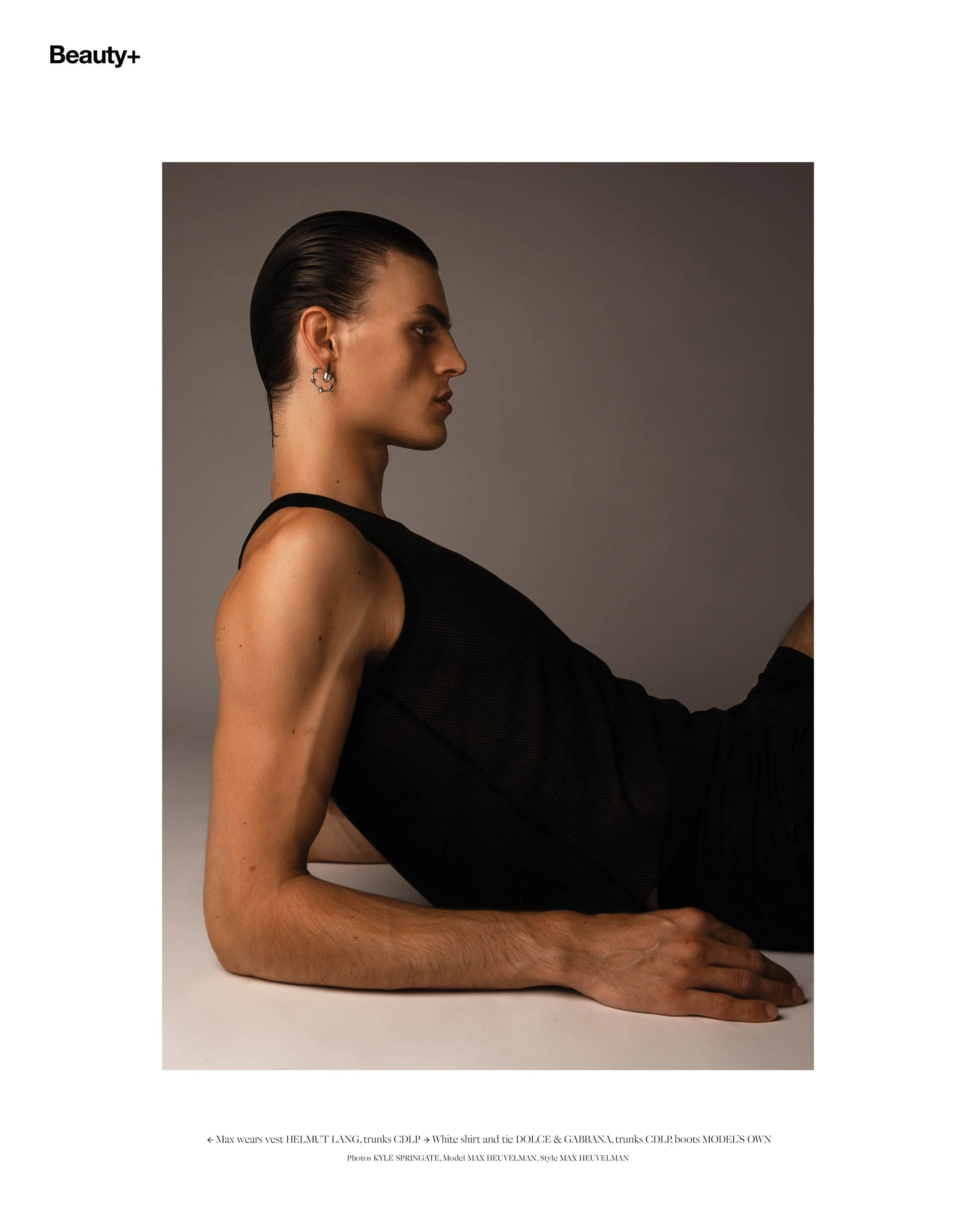 1-4. On Body: Max Heuvelman wears Vanilla Sex Eau de Parfum TOM FORD, Trousers LOUIS GABRIEL NOUCHI 5-6. On Hair: Max wears BALMAIN HAIR COUTURE, On Skin: THE GREY, White shirt and tie DOLCE & GABBANA, trunks CDLP, boots MODEL’S OWN 7-8. Max wears Vest HELMUT LANG, trunks CDLP, Earring STYLIST’S OWN 9-10. Max wears vest HELMUT LANG, trunks CDLP, White shirt and tie DOLCE & GABBANA, trunks CDLP, boots MODEL’S OWN
