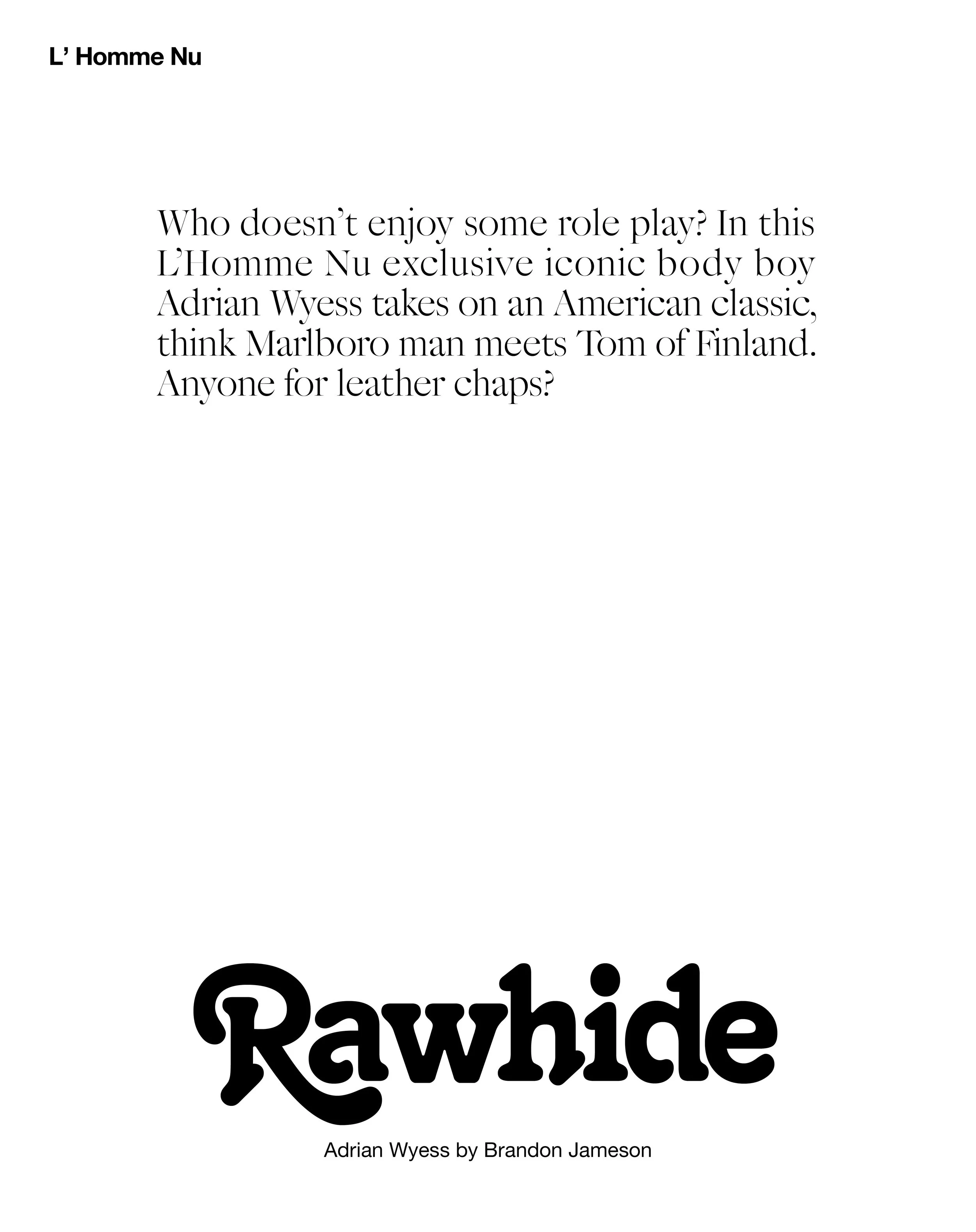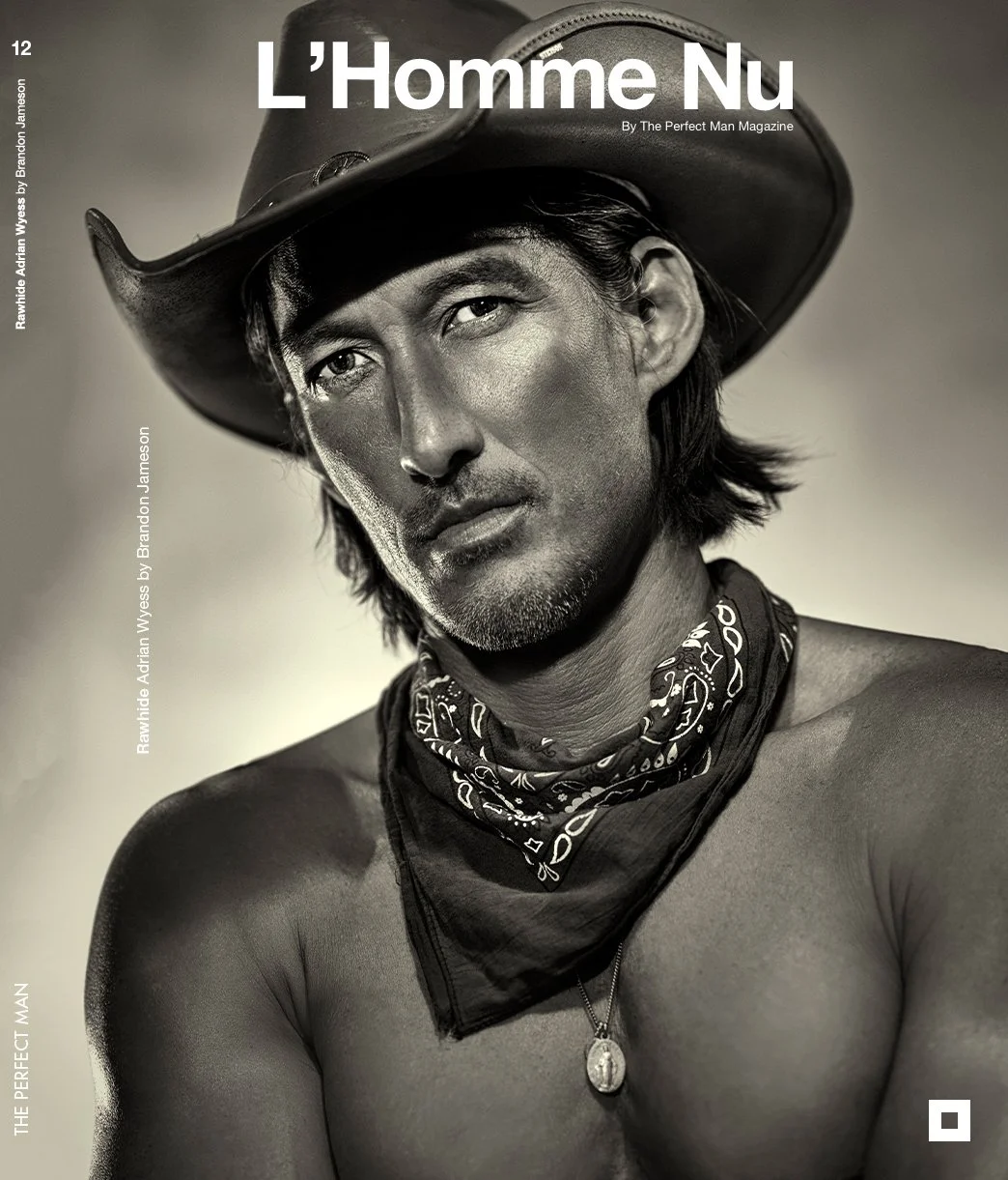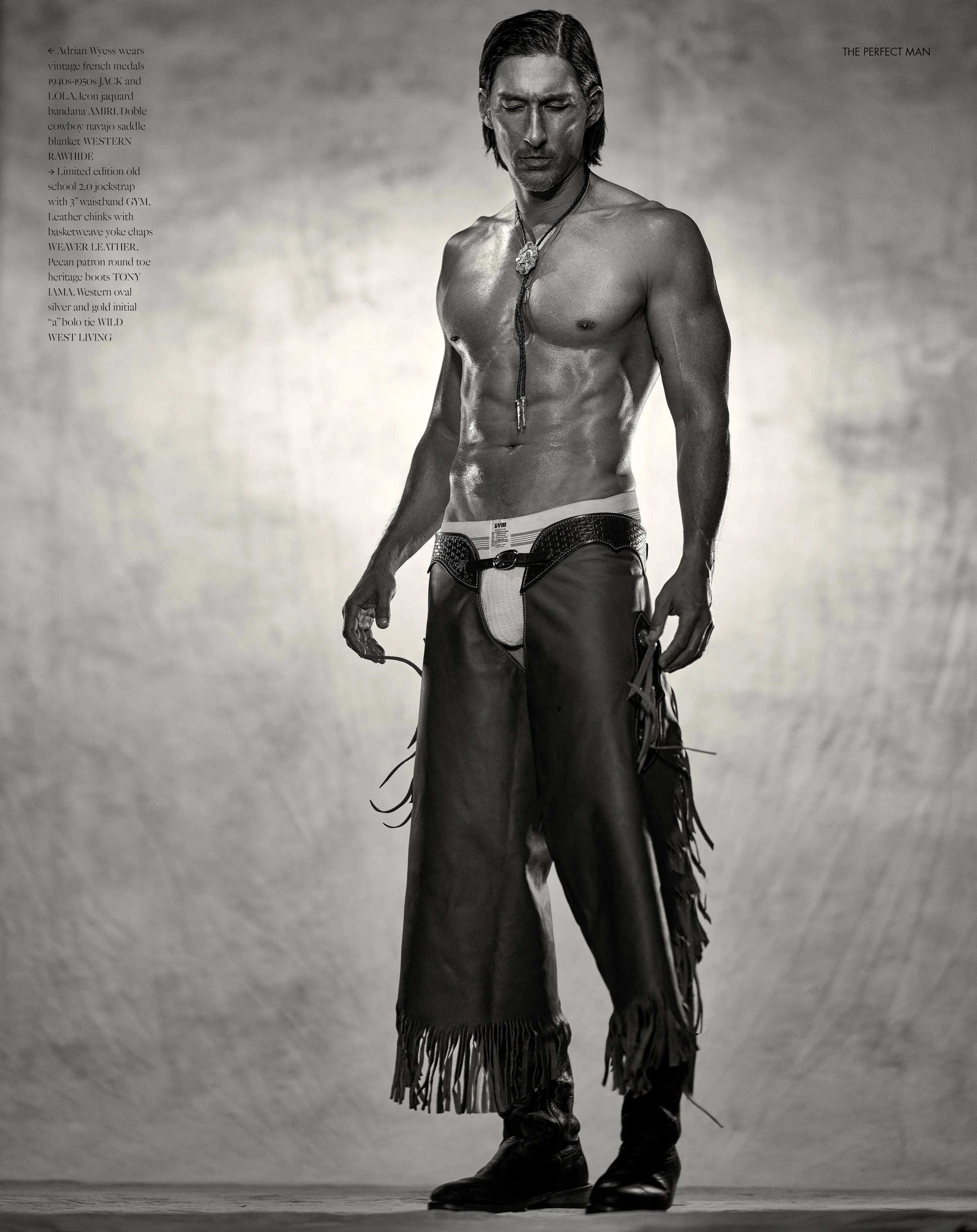 1-4. Adrian Wyess wears destroyed slim fit jeans GIVENCHY, mocha leather classic cowboy hat STETSON, vintage classic v front “tighty-whities” briefs HANES, Lambskin leather tactical vest GIVENCHY, folk buckle leather belt SAINT LAURENT, limited edition old school 2.0 jockstrap with 3” waistband GYM, Comet 18k yellow gold and leather bracelets TANE MEXICO 1942, Pecan patron round toe heritage boots TONY LAMA, Icon jaquard bandana AMIRI 5-6. Adrian Wyess wears vintage french medals 1940s-1950s JACK and LOLA, Icon jaquard bandana AMIRI, Doble cowboy navajo saddle blanket WESTERN RAWHIDE, Limited edition old school 2.0 jockstrap with 3” waistband GYM, Leather chinks with basketweave yoke chaps WEAVER LEATHER, Pecan patron round toe heritage boots TONY IAMA, Western oval silver and gold initial “A” bolo tie WILD WEST LIVING 7-8. Adrian Wyess wears mocha leather classic cowboy hat STETSON, Western oval silver and gold initial “a” bolo tie WILD WEST LIVING, posing strap VINTAGE, Pecan patron round toe heritage boots TONY LAMA, Destroyed slim fit jeans GIVENCHY, mocha leather classic cowboy hat STETSON, vintage classic v-front “tighty-whities” briefs HANES 7-8. Adrian Wyess wears Mocha leather classic cowboy hat STETSON, Icon jaquard bandana AMIRI, Distressed denim jacket RALPH LAUREN, Thermal henley and joggers FEAR OF GOD ESSENTIALS, vintage french medals 1940s-1950s JACK & LOLA, Comet 18k yellow gold and leather bracelets TANE MEXICO 1942 9-10. Thermal henley and joggers FEAR OF GOD ESSENTIALS, vintage french medals 1940s-1950s JACK & LOLA, Comet 18k yellow gold and leather bracelets TANE MEXICO 1942, Adrian Wyess wears mocha leather classic cowboy hat STETSON, vintage classic v-front “tighty-whities” briefs HANES, vintage french medals 1940s-1950s JACK & LOLA, Western tanned leather arm guards VIKING BRACERS
