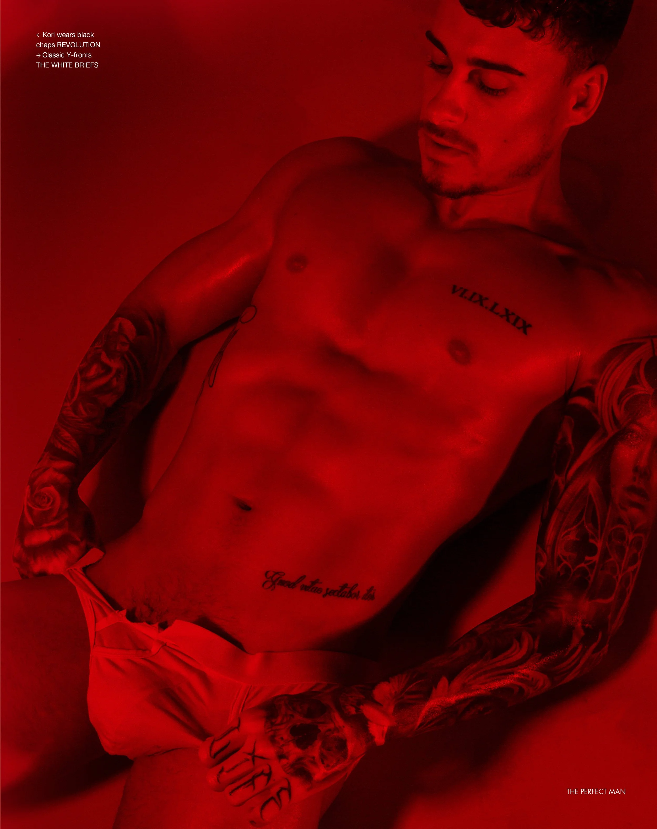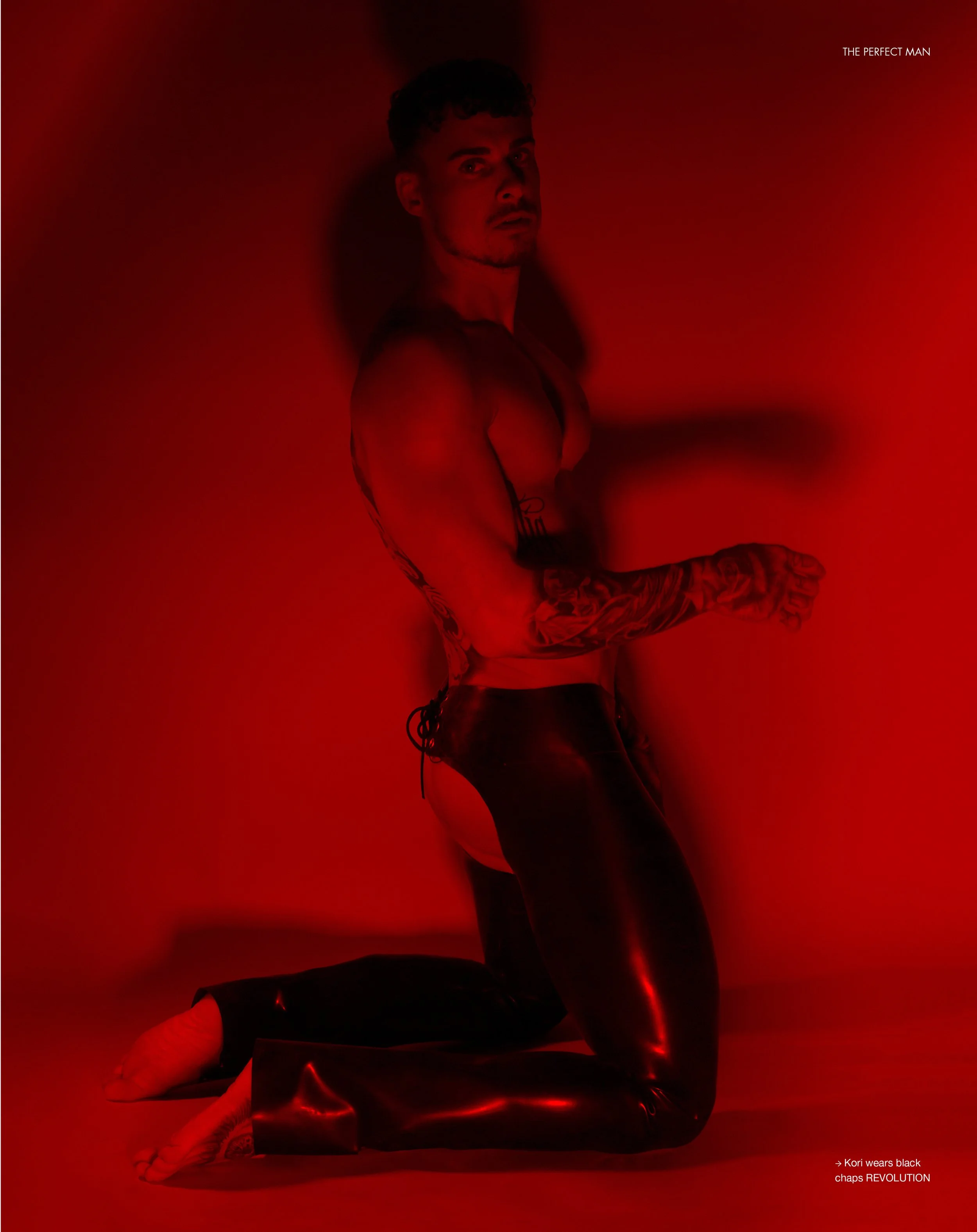1-4. Kori wears black chaps REVOLUTION 5-8. Kori wears black chaps REVOLUTION, Classic Y-fronts THE WHITE BRIEFS 9-12. Kori wears black jockstrap CLONEZONE