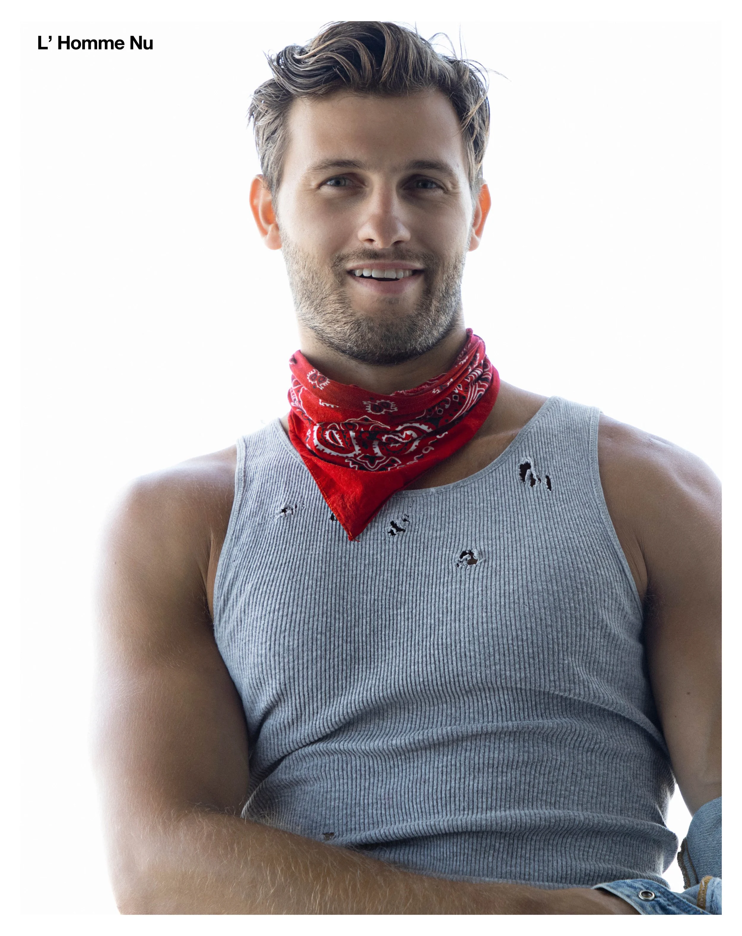 1-4. Sam wears short sleeve denim shirt G-STAR RAW 5-6 Sam wears gray customized tank top MODEL’S OWN 7-8 Sam wears shorts MODEL’S OWN 9-10 Sam wears short sleeve denim shirt G-STAR RAW, white briefs CALVIN KLEIN 11-14 Sam wears white low-rise sport briefs EMPORIO ARMANI 15-16 Sam wears white briefs CALVIN KLEIN