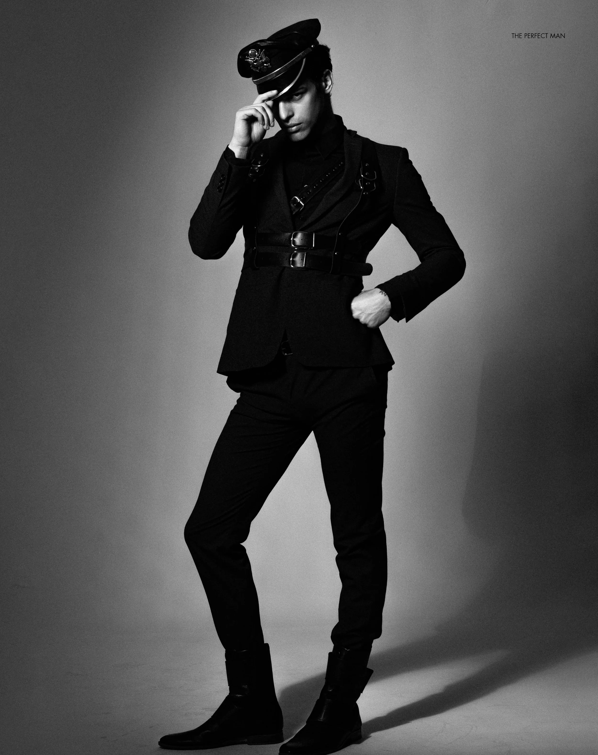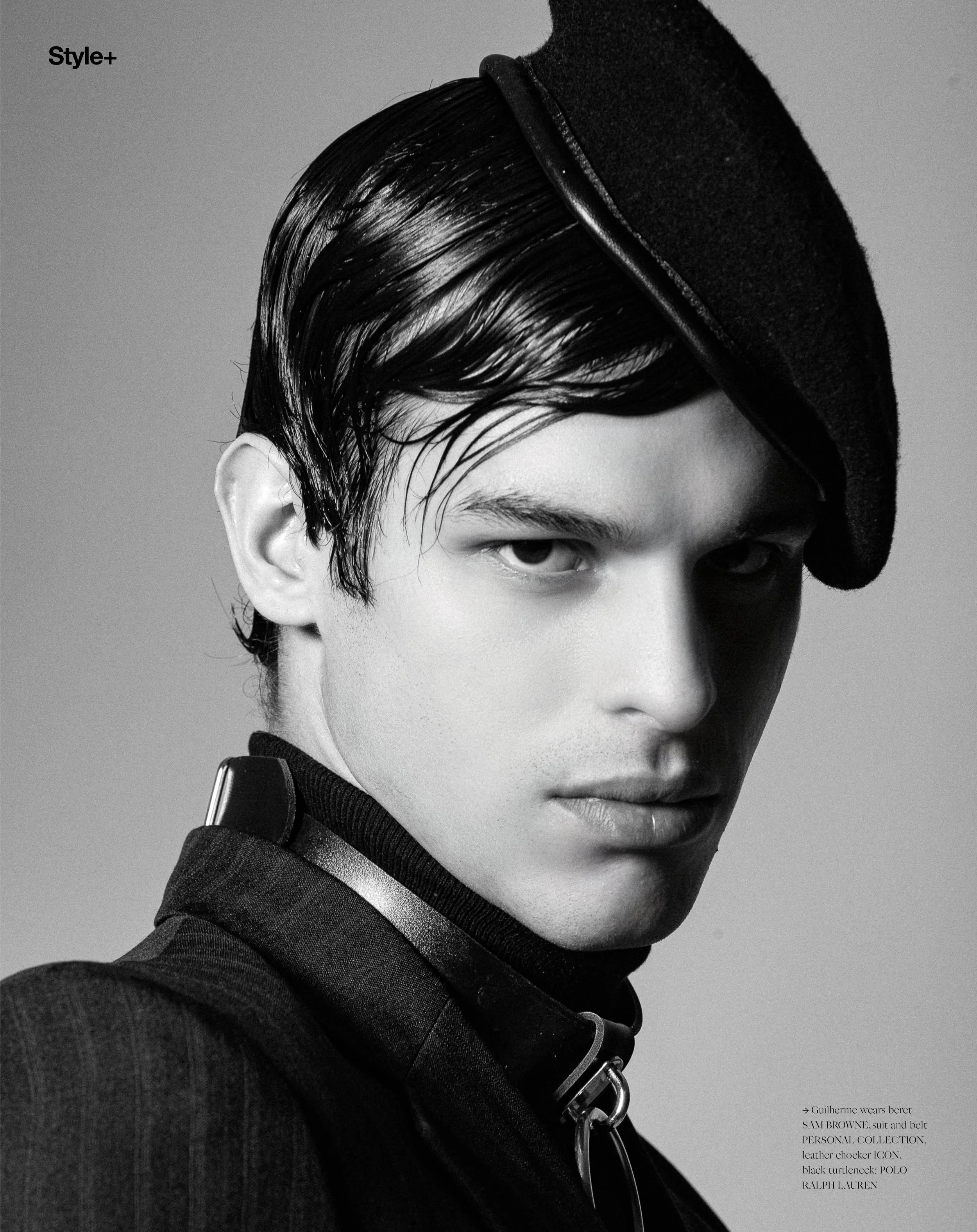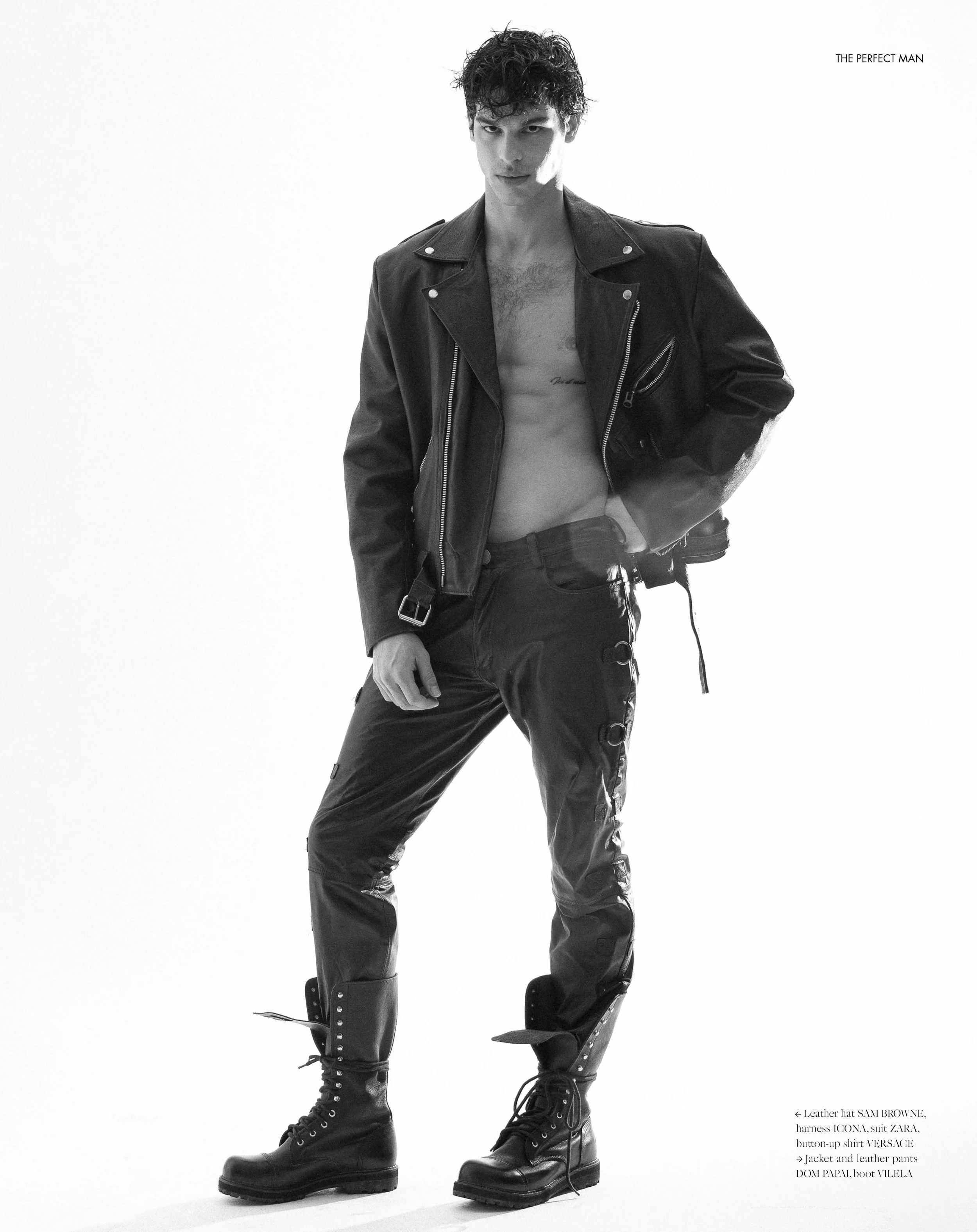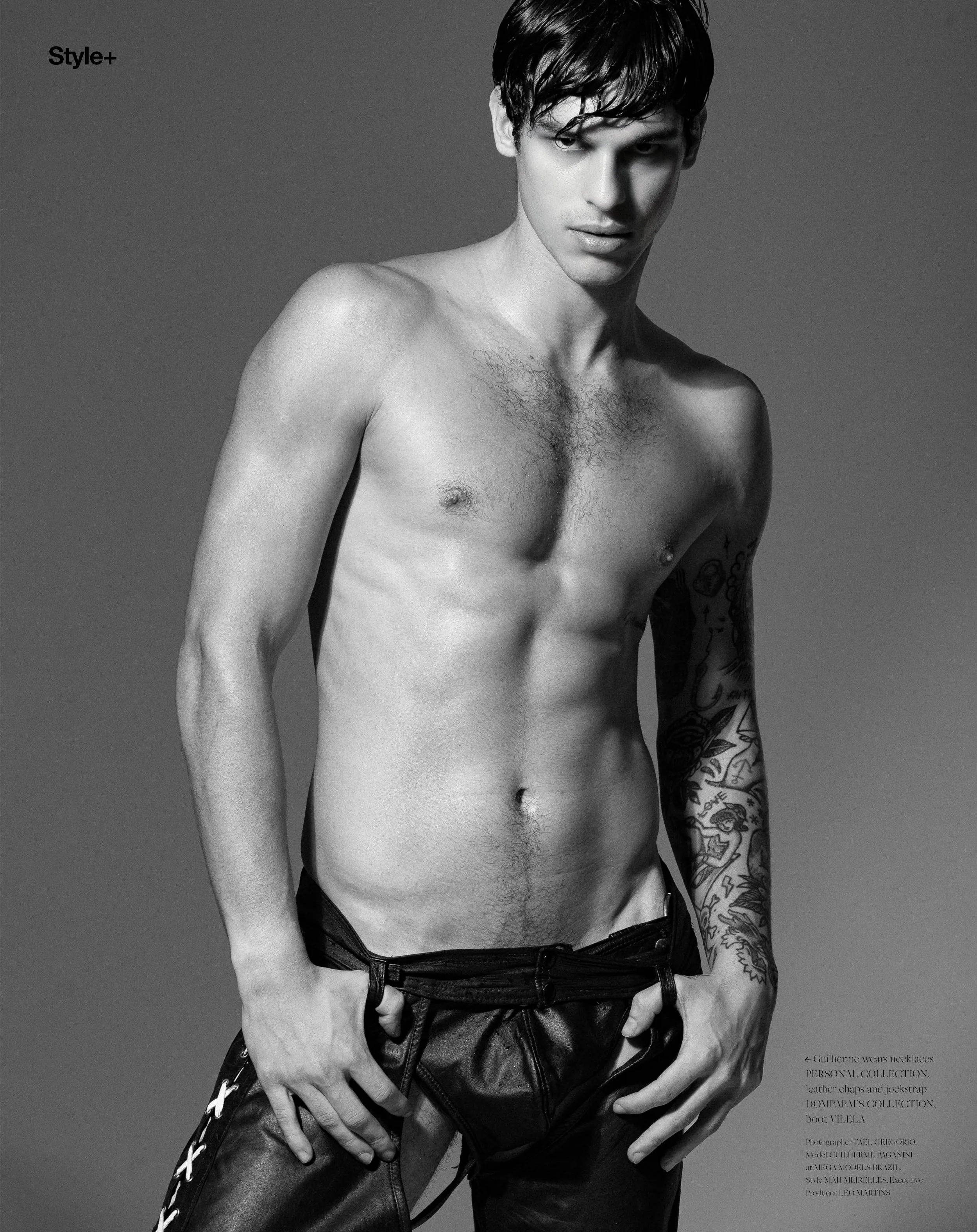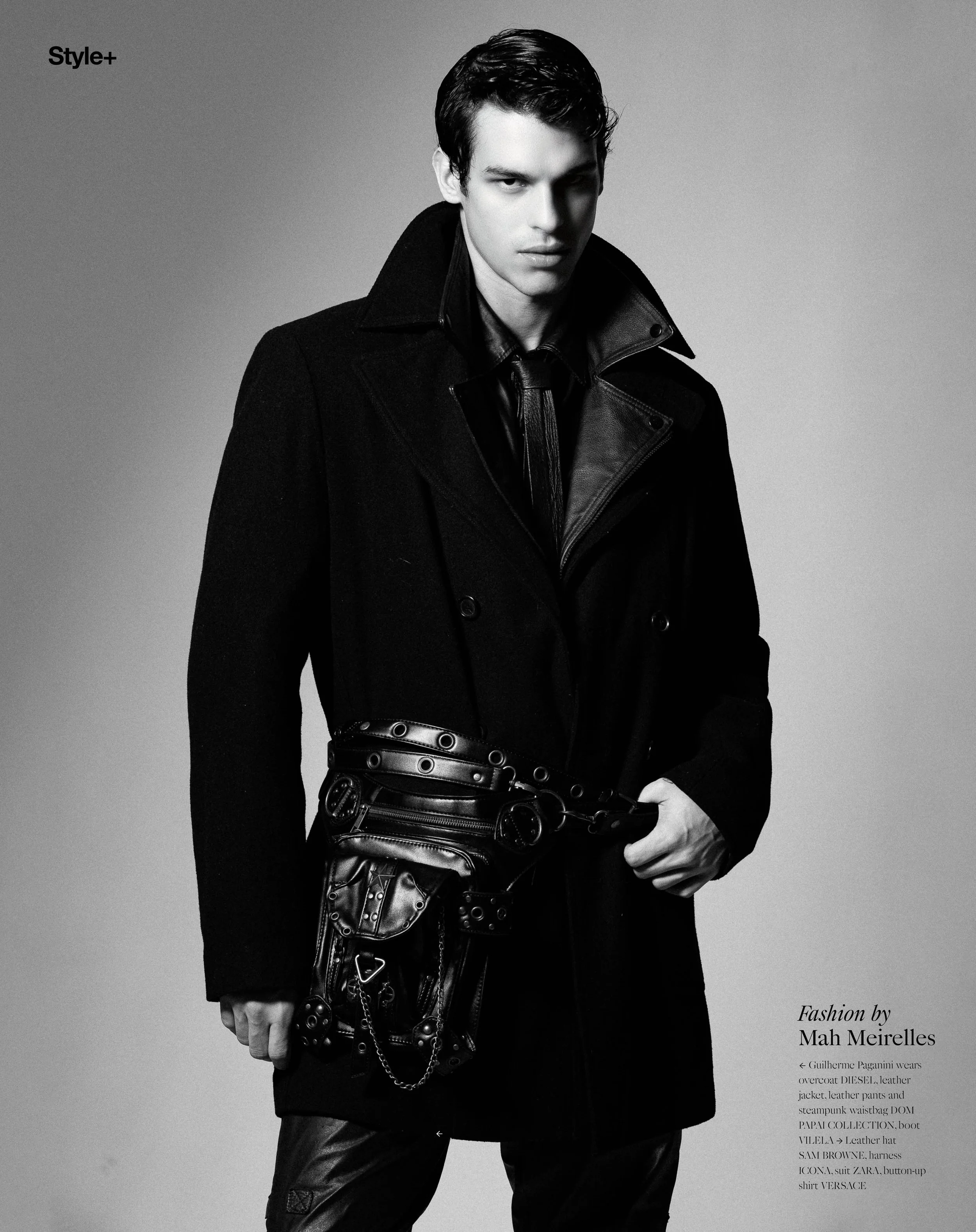 1. Guilherme Paganini wears overcoat DIESEL, leather jacket, leather pants and steampunk waistbag DOM PAPAI COLLECTION, boot VILELA, Leather hat SAM BROWNE, harness ICONA, suit ZARA, button-up shirt VERSACE 2. Guilherme wears beret SAM BROWNE, suit and belt PERSONAL COLLECTION, leather chocker Icon, black turtleneck: POLO RALPH LAUREN 3. Guilherme wears necklaces PERSONAL COLLECTION, leather chaps and jockstrap DOM PAPAI COLLECTION, boot VILELA 4. Leather hat SAM BROWNE, harness ICONA, suit ZARA, button-up shirt VERSACE, Jacket and leather pants Dom Papai, boot VILELA 5.    Guilherme wears necklaces PERSONAL COLLECTION, leather chaps and jockstrap DOM PAPAI COLLECTION, boot VILELA