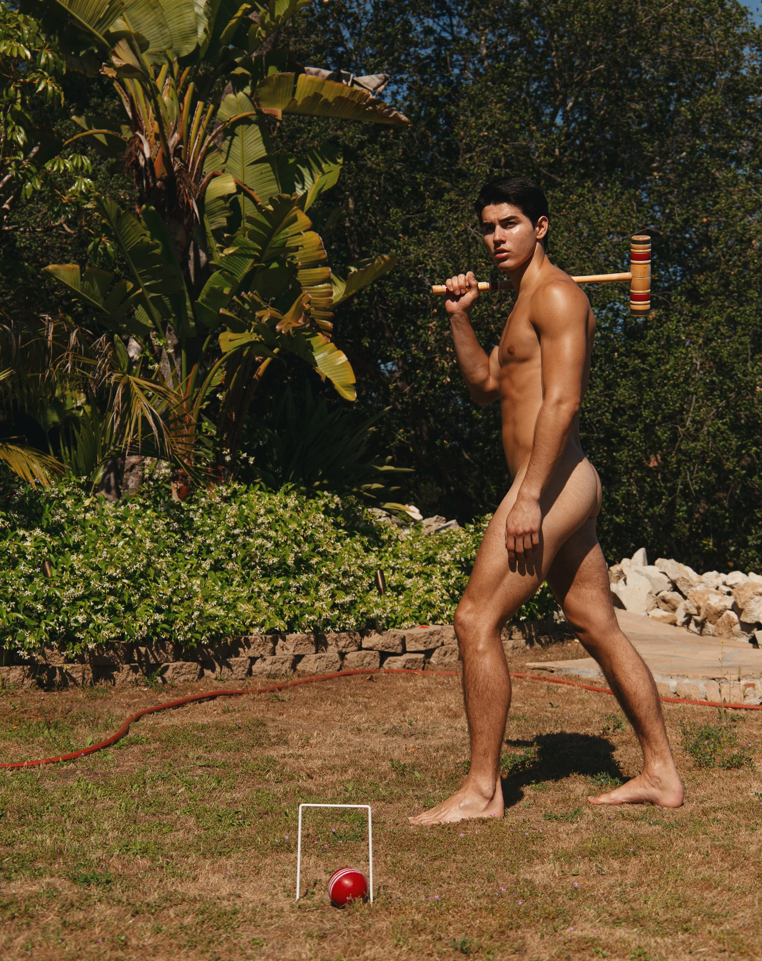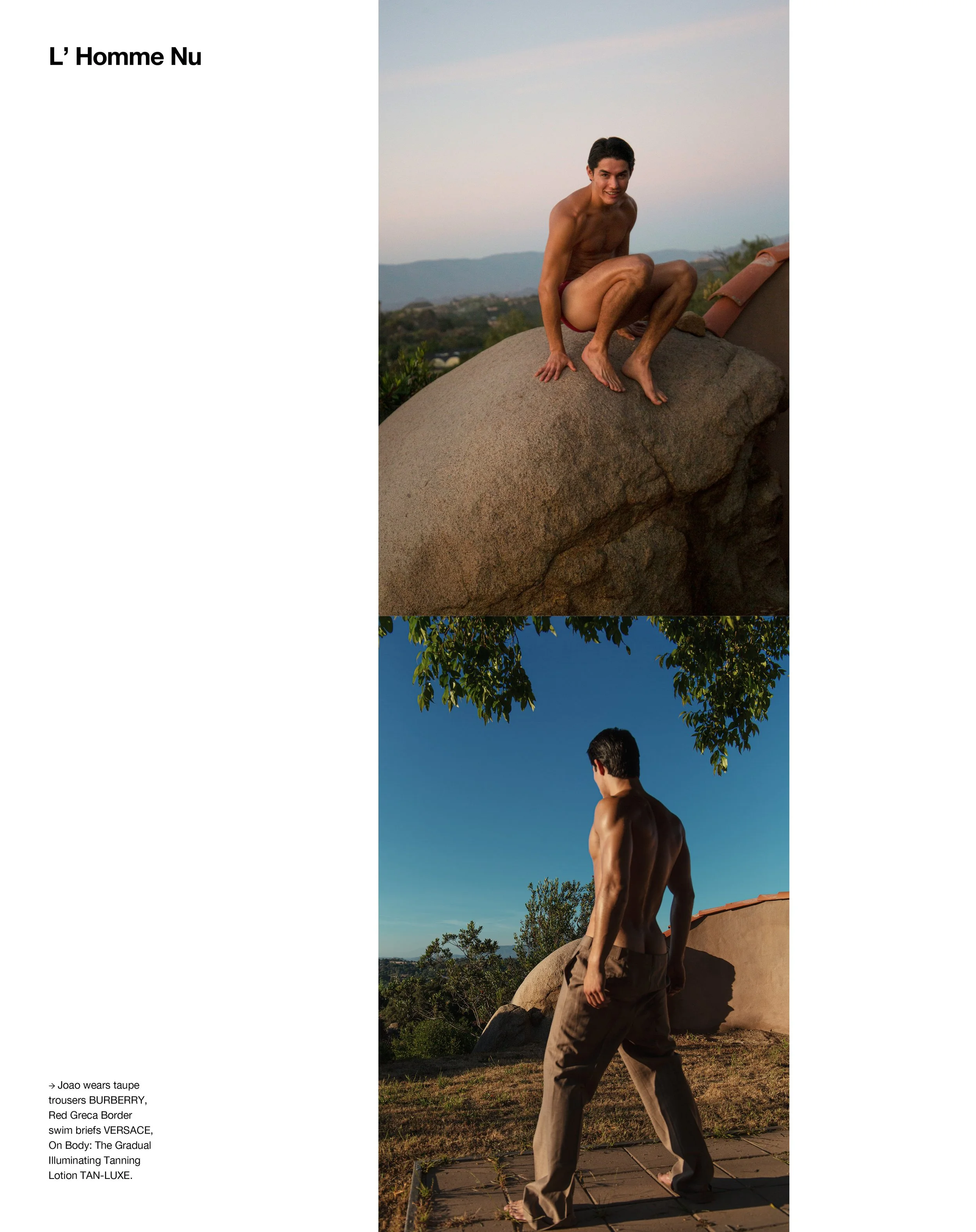 1-4. Joao wears taupe trousers BURBERRY, Red Greca Border swim briefs VERSACE, On Body: The Gradual Illuminating Tanning Lotion TAN-LUXE 5-12. On Body: Joao wears Óleo Para O Corpo Firming Oil COSTA BRAZIL