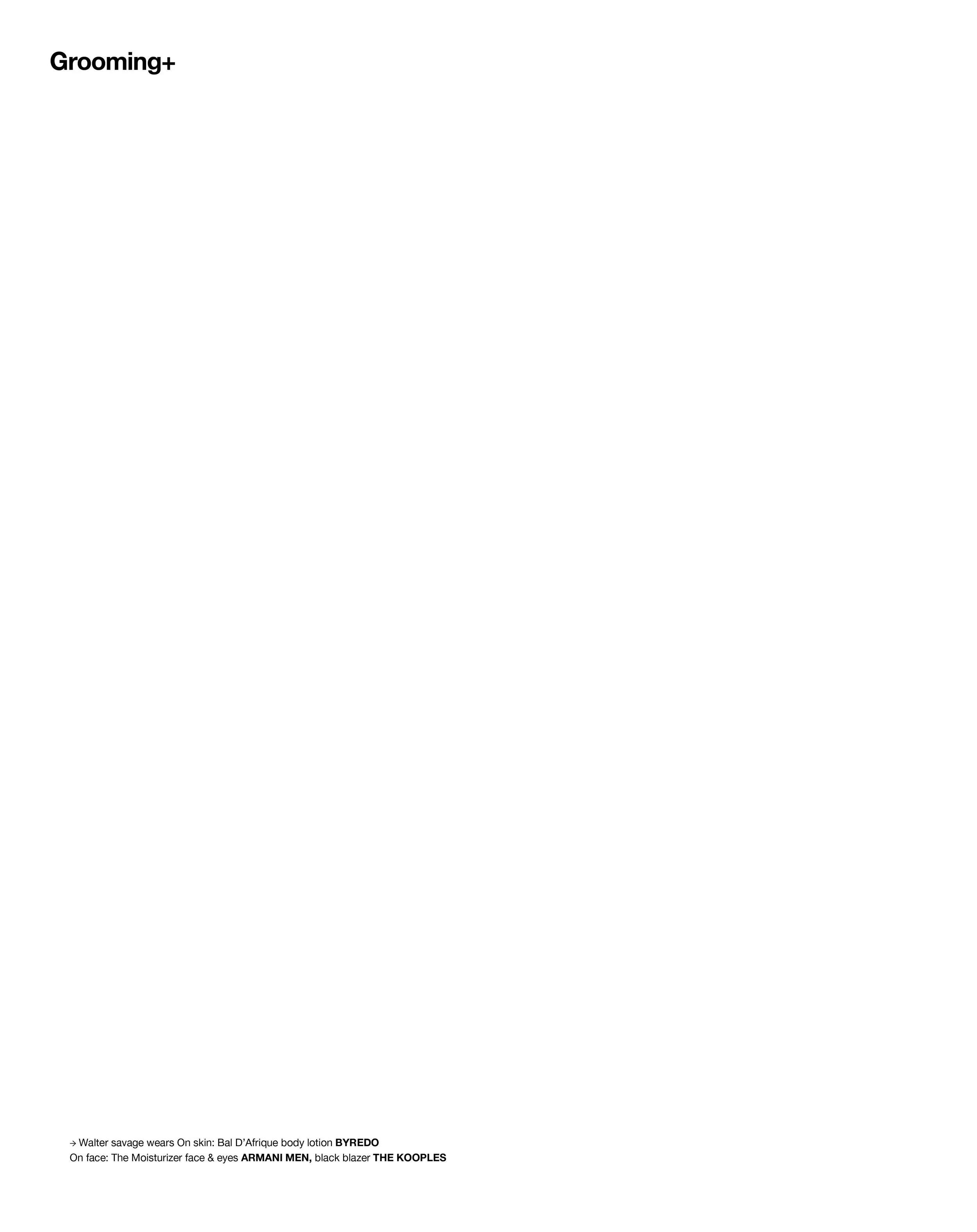 1. Walter Savage wears On skin: Bal D’Afrique body lotion BYREDO 2. Walter savage wears On skin: Bal D’Afrique body lotion BYREDO, On face: The Moisturizer face & eyes ARMANI MEN 3. Walter wears On skin: Rejuvenate Intensive body balm AESOP 4. Walter Savage wears On skin: Bal D’Afrique body lotion BYREDO, On face: The Moisturizer face & eyes ARMANI MEN, crisp white shirt GIORGIO ARMANI 5. Walter Savage wears On skin: Bal D’Afrique body lotion BYREDO On face: The Moisturizer face & eyes ARMANI MEN, black blazer THE KOOPLES