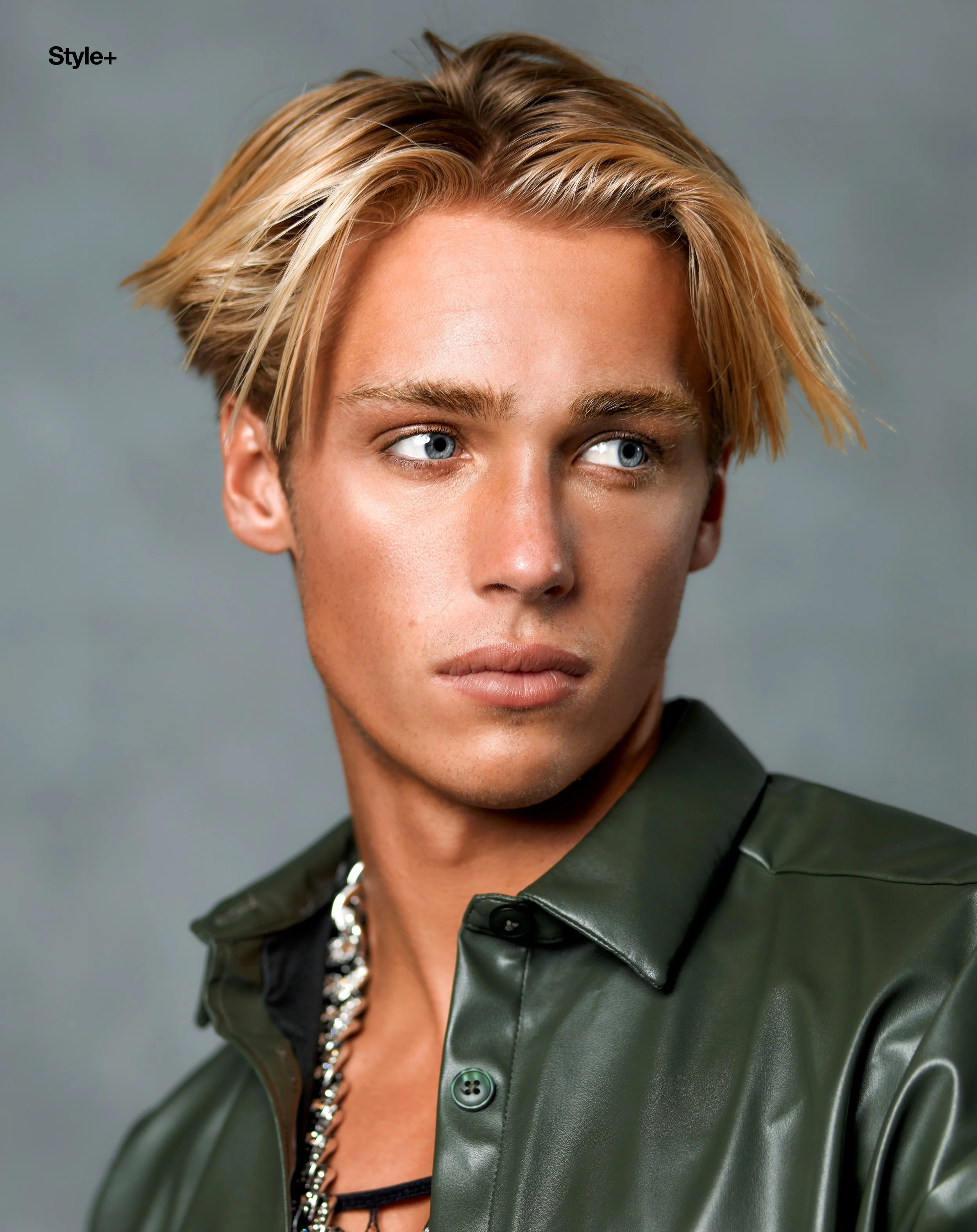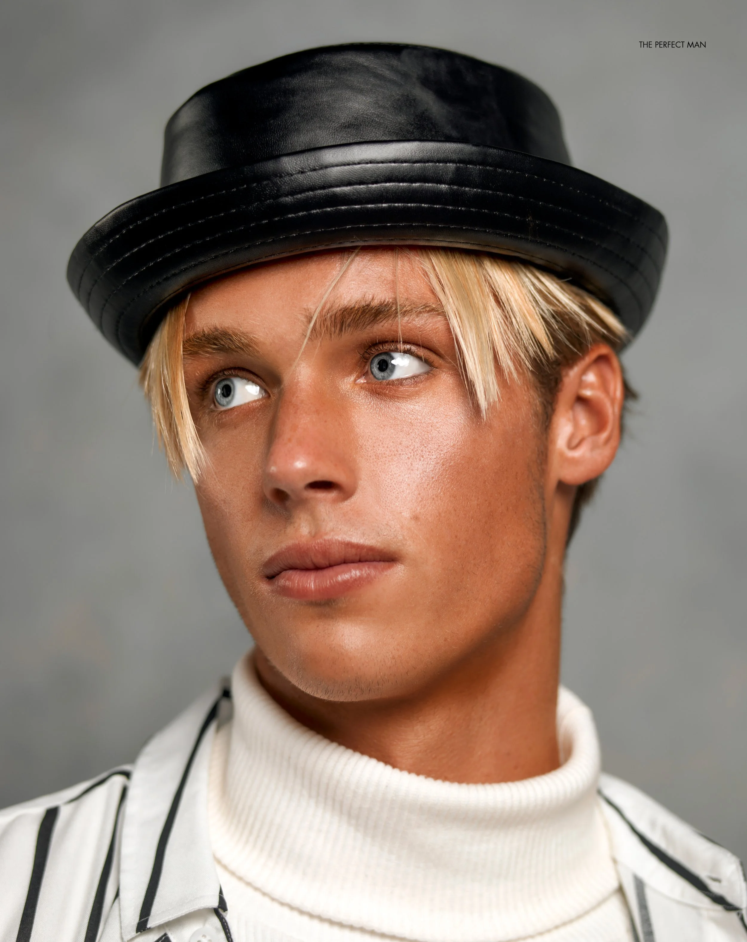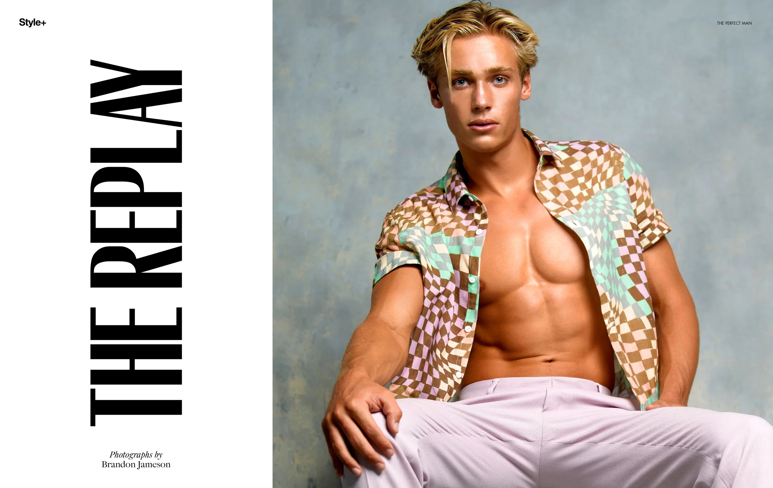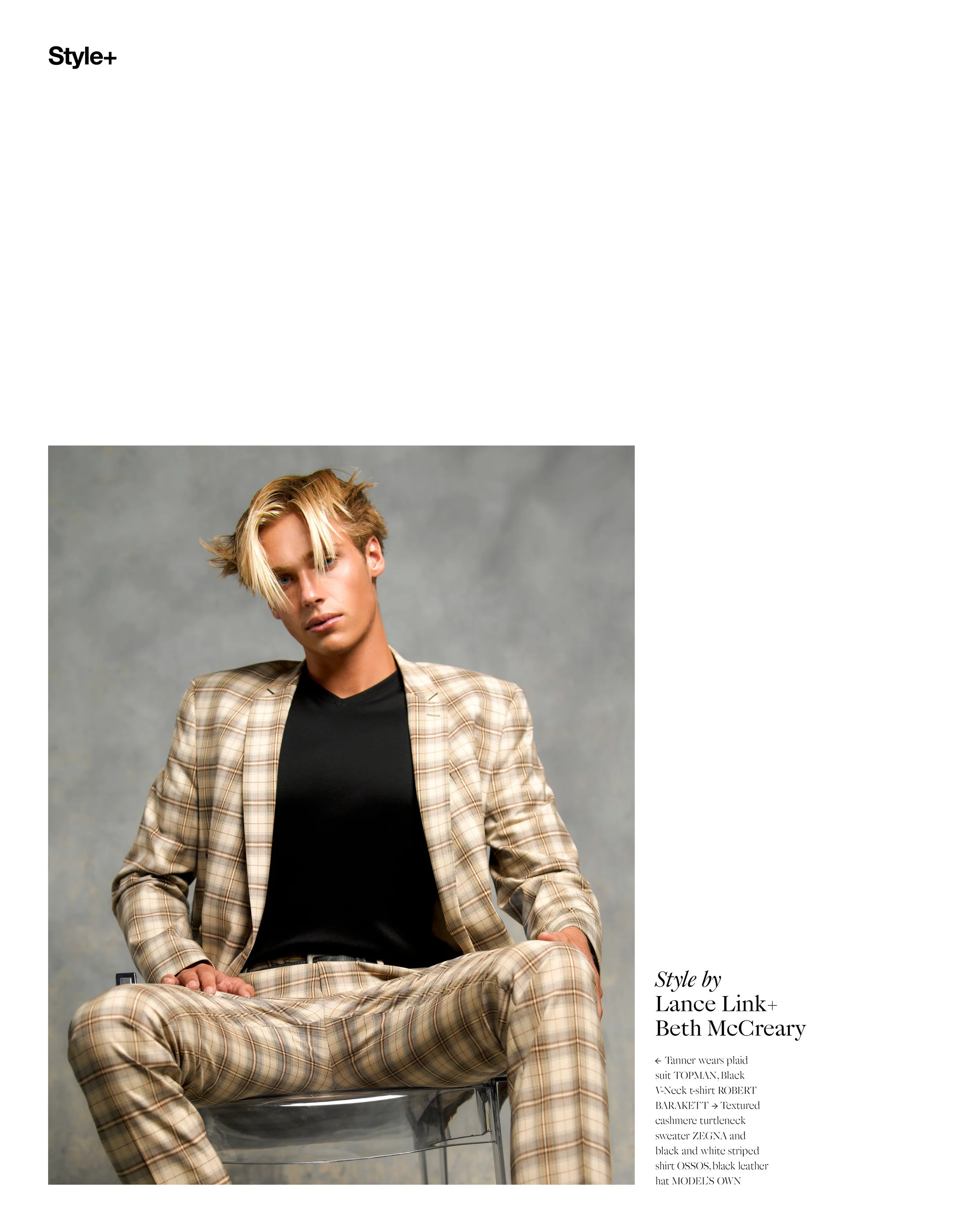 1-4. Tanner McCreary wears peachy-pink sleeveless t-shirt and lavander trousers TOPMAN, Meno faux leather khaki button-up shirt NANUSHKA,  30″solid Cuban Link 14k gold mens diamond chain 60 Carats IT’S HOT, Peach and seafoam striped T-Shirt TOPMAN 5-8. Tanner wears plaid suit TOPMAN, Black V-Neck t-shirt ROBERT BARAKETT, Textured cashmere turtleneck sweater ZEGNA and black and white striped shirt OSSOS, black leather hat MODEL’S OWN 9-10. Tanner wears beige, black and white plaid sleeveless button shirt TOPMAN, On skin: The Eau de Mervailles Body lotion HERMES, On hair: Hair products BALMAIN HAIRCARE