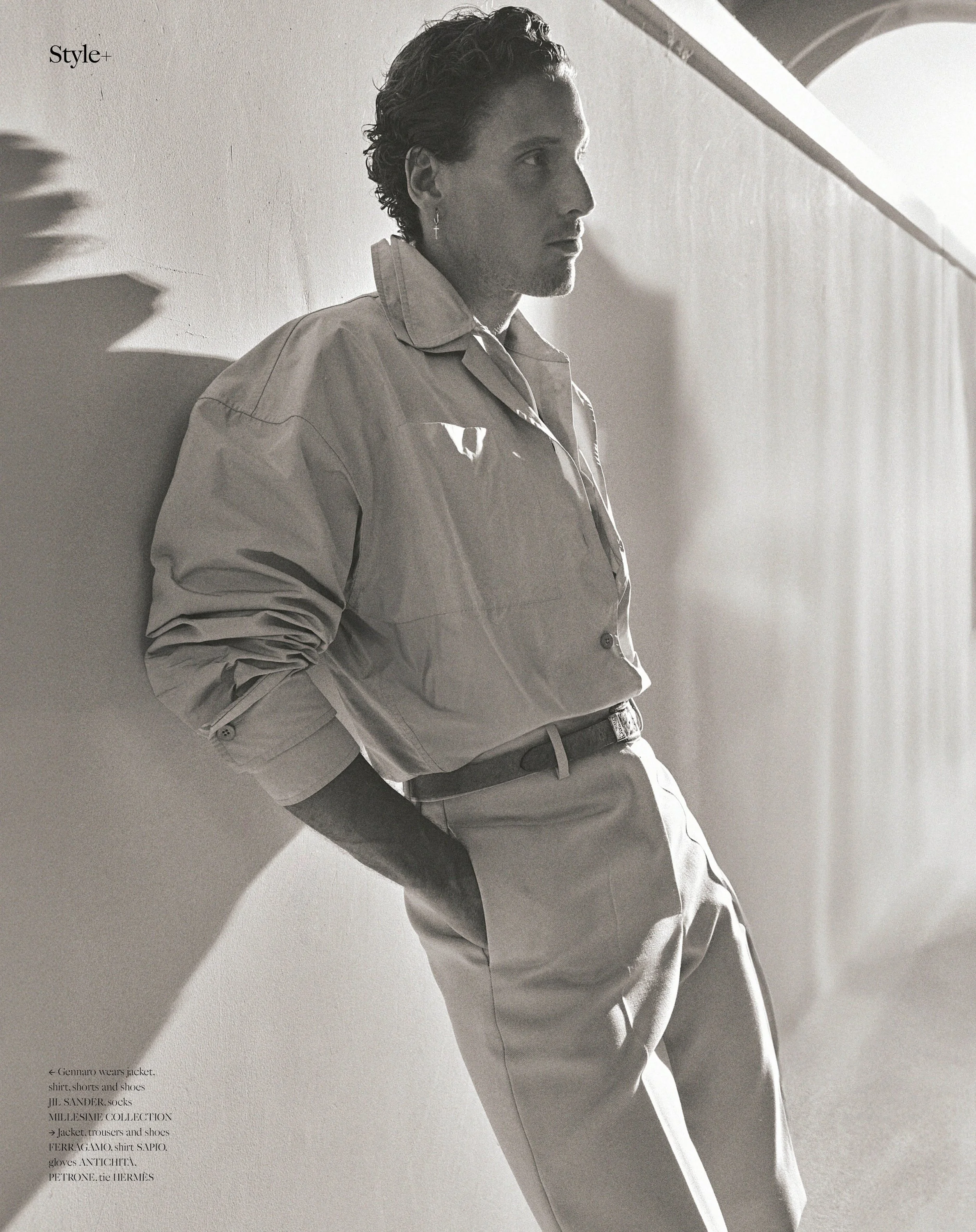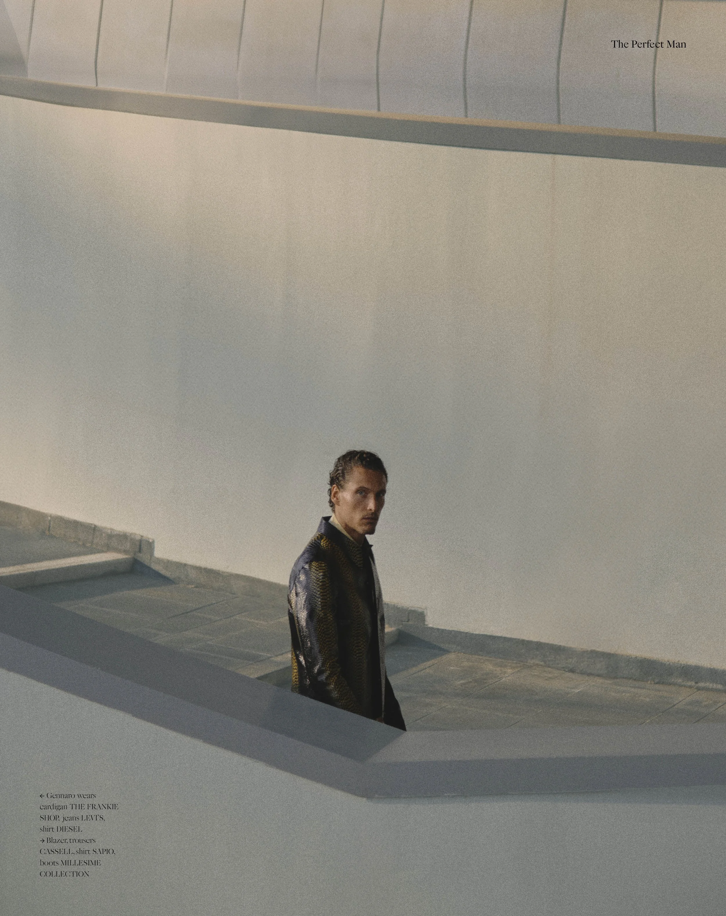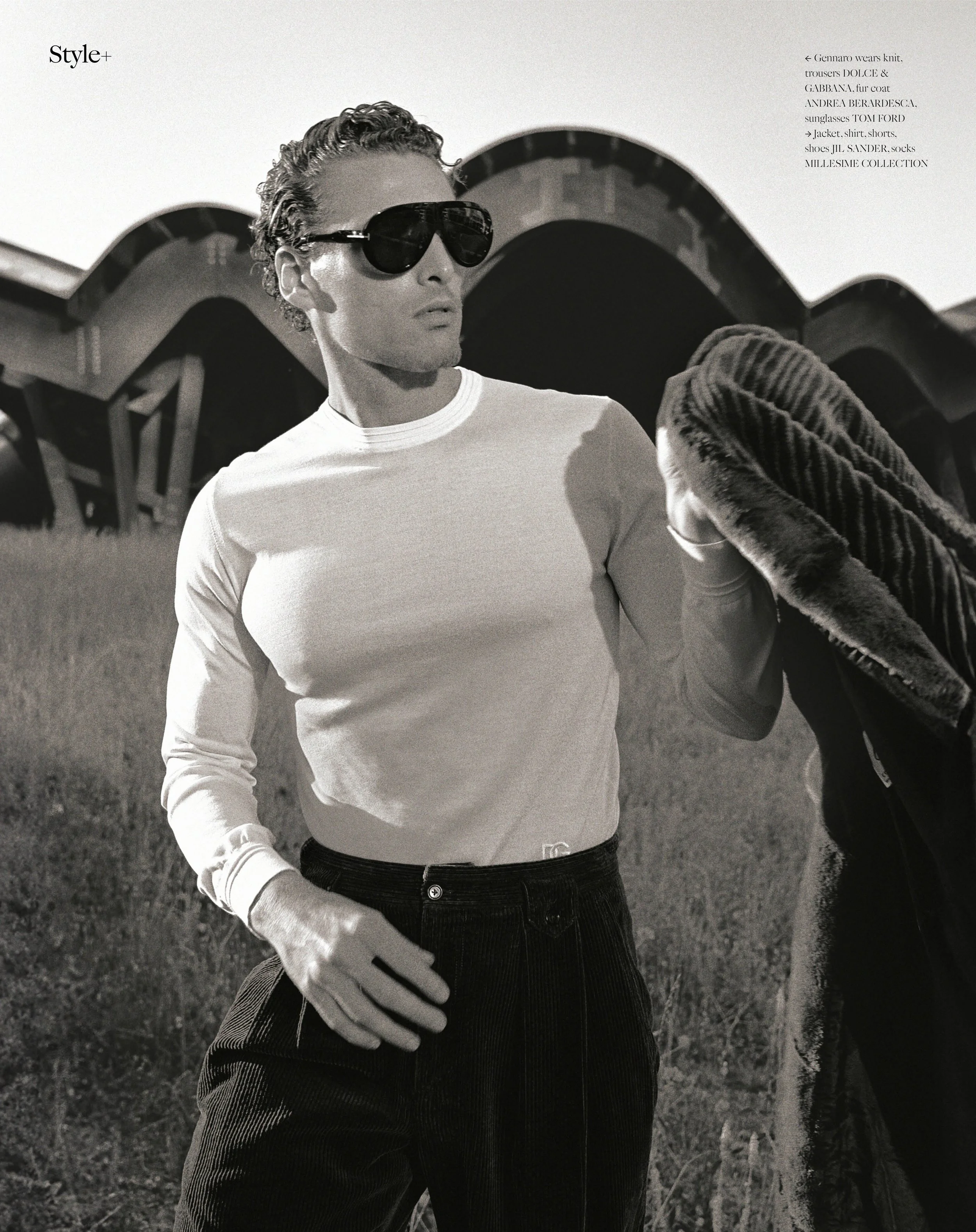 1-2. Gennaro Lillio wears jacket, trousers, shoes FERRAGAMO, shirt SAPIO, gloves ANTICHITÀ PETRONE, tie HERMÈS, Jacket, shirt, shorts, shoes JIL SANDER, socks MILLESIME COLLECTION 3-4. Gennaro wears knit, trousers DOLCE & GABBANA, fur coat ANDREA BERARDESCA, sunglasses TOM FORD, Jacket, shirt, shorts, shoes JIL SANDER, socks MILLESIME COLLECTION 5-6. Gennaro wears cardigan THE FRANKIE SHOP, jeans LEVI’S, shirt DIESEL, Blazer, trousers CASSELL, shirt SAPIO, boots MILLESIME COLLECTION 7-8. Gennaro wears gray blazer, trousers and cap DOLCE & GABBANA, Knit, trousers DOLCE & GABBANA, fur coat ANDREA BERARDESCA, sunglasses TOM FORD 9-10. Gennaro wears cardigan THE FRANKIE SHOP, jeans LEVI’S, shirt DIESEL, Jacket, shirt, shorts and shoes JIL SANDER, socks MILLESIME COLLECTION 11-12. Gennaro wears jacket, shirt, shorts and shoes JIL SANDER, dress socks MILLESIME COLLECTION 13-14. Gennaro wears knit and trousers DOLCE & GABBANA, fur coat ANDREA BERARDESCA, sunglasses TOM FORD, Cardigan THE FRANKIE SHOP, jeans LEVI’S, striped shirt DIESEL 15-16. Gennaro wears blazer and trousers CASSELL, shirt SAPIO, boots MILLESIME COLLECTION, Blazer, trousers, cap DOLCE & GABBANA 17-18. Gennaro wears jacket, shirt, shorts and shoes JIL SANDER, socks MILLESIME COLLECTION, Jacket, trousers and shoes FERRAGAMO, shirt SAPIO, gloves ANTICHITÀ, PETRONE, tie HERMÈS 19-20. Gennaro wears cardigan THE FRANKIE SHOP, jeans LEVI’S, striped shirt DIESEL, Jacket STYLIST’S OWN, blue jeans LEVI’S 21-22.