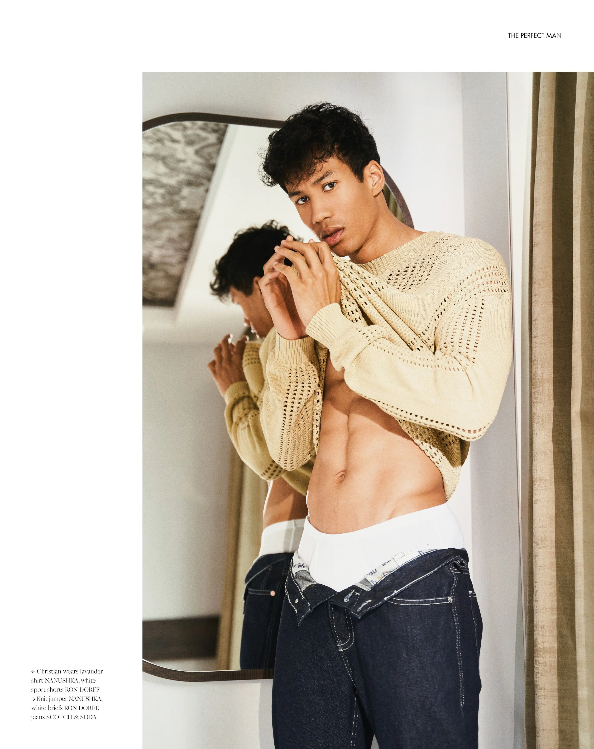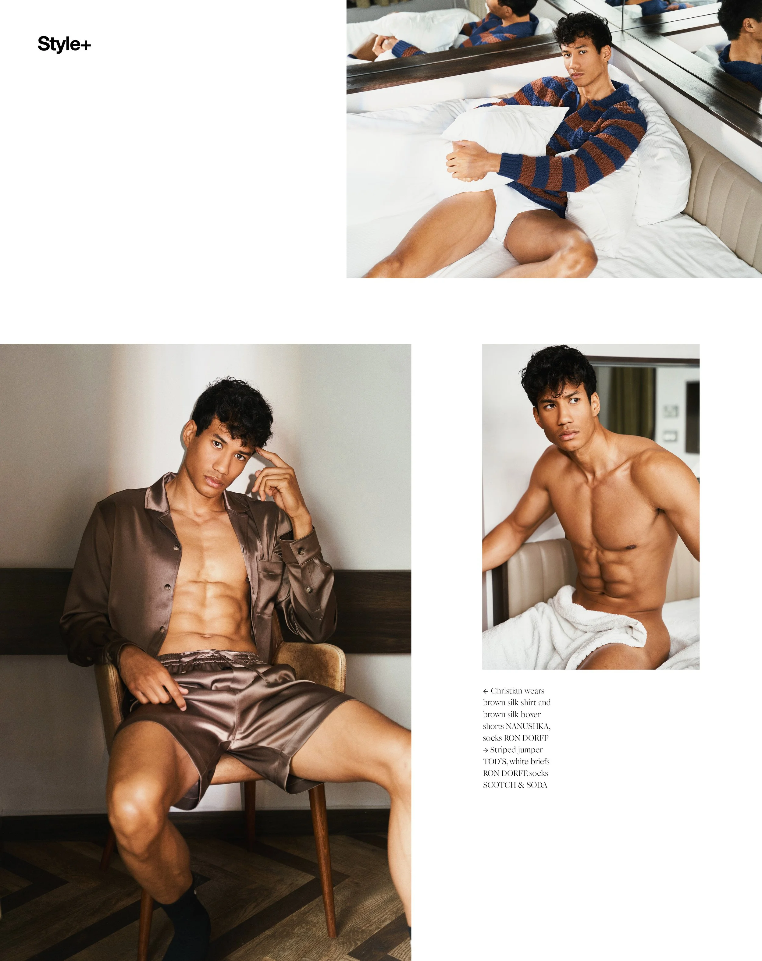 1-4. Christian wears brown silk shirt and brown silk boxer shorts NANUSHKA, socks RON DORFF, Striped jumper TOD’S, white briefs RON DORFF, socks SCOTCH & SODA  5-6. On skin: Christian wears A Midnight Stroll Eau de Pardum GUCCI BEAUTY  7-8. Christian wears lavander shirt NANUSHKA, white sport shorts RON DORFF, Knit jumper NANUSHKA, white briefs RON DORFF, jeans SCOTCH & SODA 9-10. Christian wears knit jumper and shorts TOD’S, socks SCOTCH & SODA, Mesh vest, black t-shirt and briefs RON DORFF, light blue jeans LEE 11-12. Christian wears silk boxer shorts NANUSHKA, brown socks FALKE